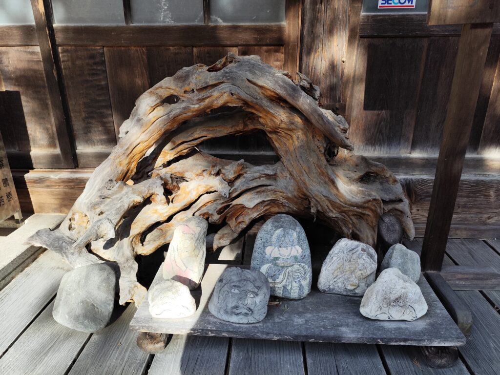 また、天井は千社札が貼ってあるように見えるよう、文字を彫って黒漆を施した装飾天井になっているのも特徴。回廊には奪衣婆が鎮座する小さなお堂や、達磨大師などが描かれた石が並んでいる。