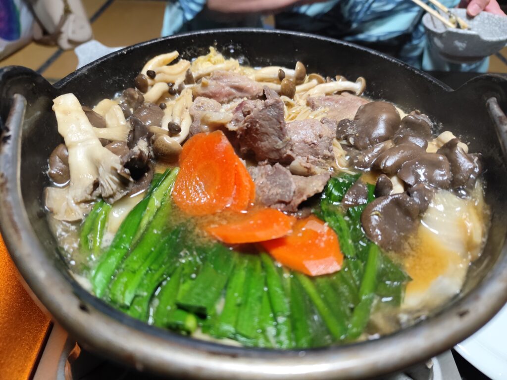 コタツの上に料理を並べていただく際、ご主人にいのしし鍋以外の鍋料理について聞く。