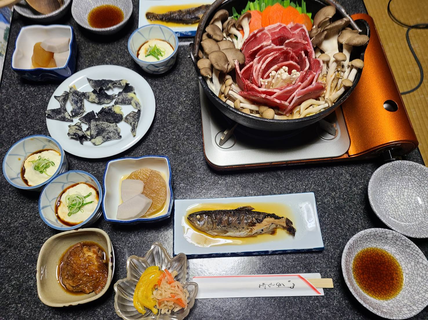 コタツの上に料理を並べていただく際、ご主人にいのしし鍋以外の鍋料理について聞く。