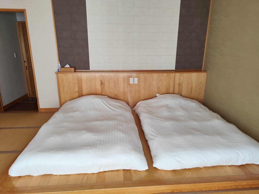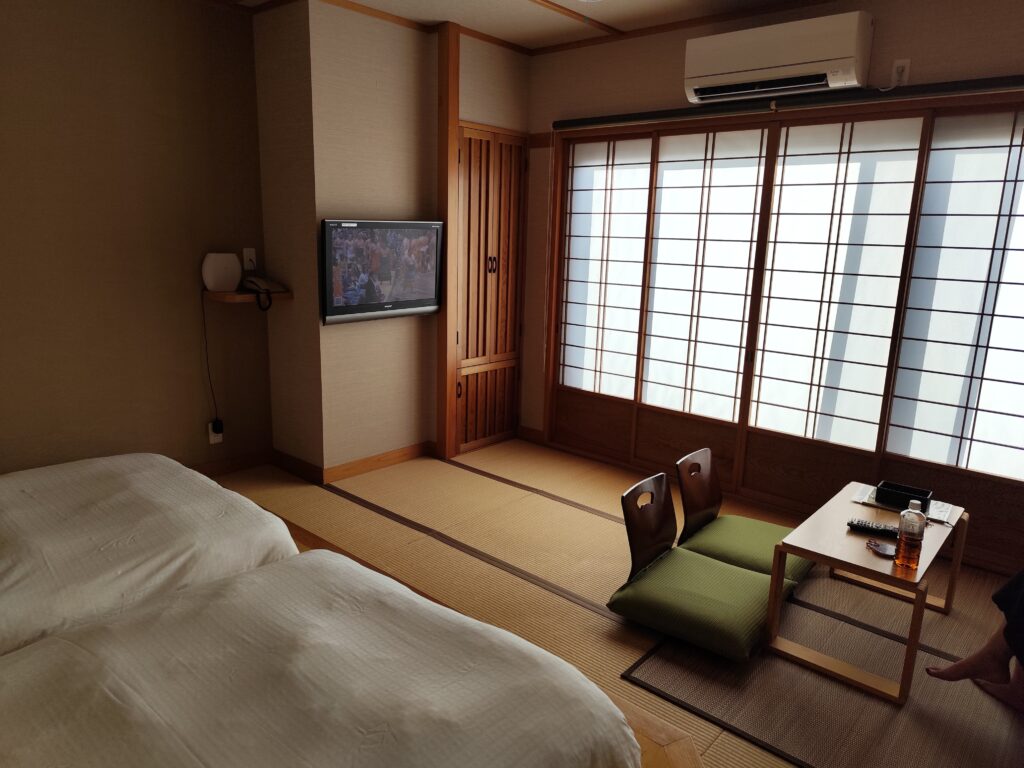 この日、ワタシたちが通されたのは海側の「桜の間」。こぢんまりとした部屋だが、エアコンやテレビ、トイレや空の冷蔵庫など設備は過不足なく揃っている。