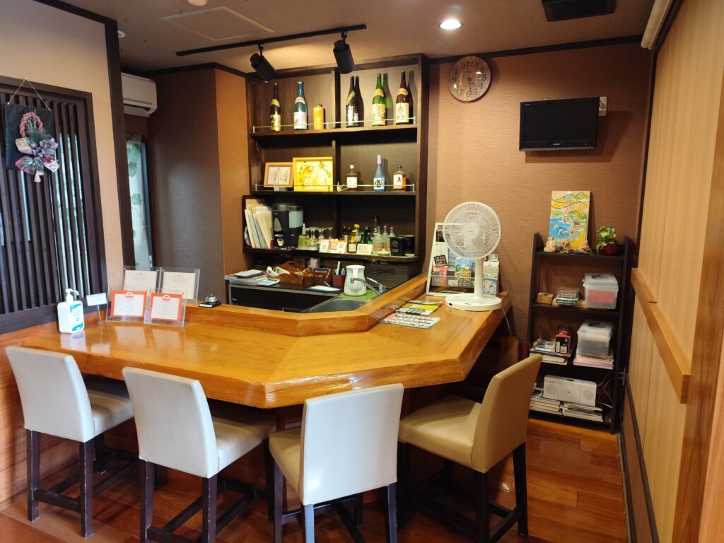 お宿のフロント兼カウンターにはお酒がいろいろと並んでいて、ホームページを見るとこちらでお酒をいただけるようだ。
