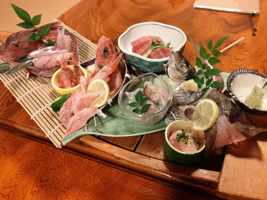 食事が用意された部屋に入ってみると、最初に目に飛び込んできたのが豪勢な船盛! テーブルには他にも前菜や茶碗蒸しも並んでいて、どれもおいしそうだ。