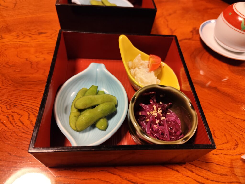 まずは前菜を…とわさび漬けを何気なくつまんでみると、これがほんのりと甘い。正直、わさび漬けのぴりっとした辛さがワタシは少々苦手なのだが、こちらのわさび漬けはおいしかった。