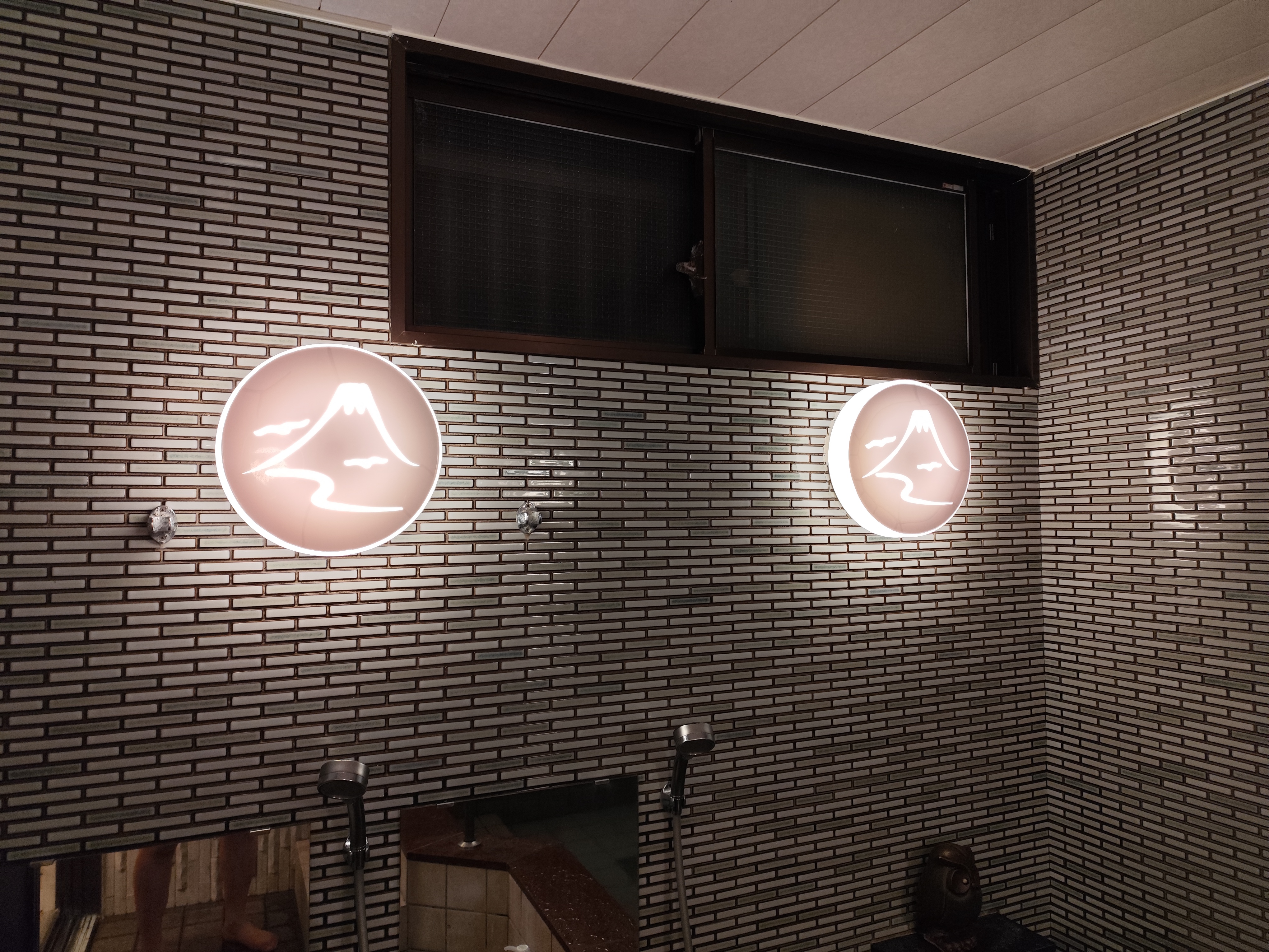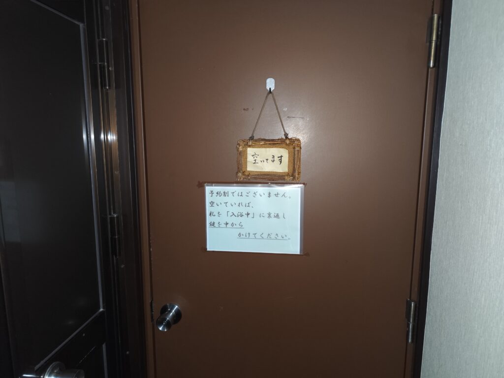 「三代目あだち」のお風呂は予約制ではなく、出入り口のボードが「空いてます」になっていたら入浴できる。自分が入浴する際にはこのボードを裏返しておくことを忘れずに。