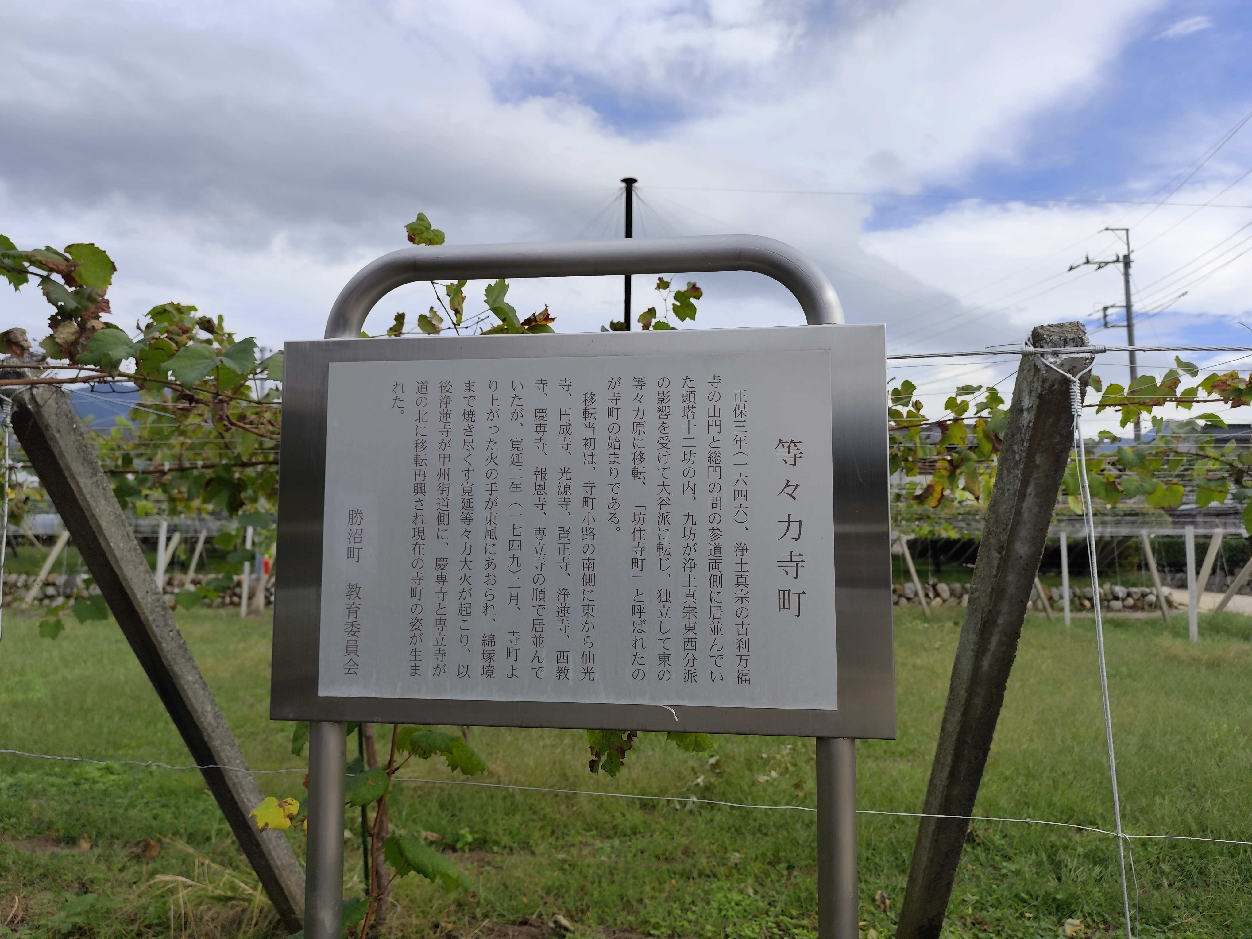 つまり、勝沼ぶどう郷に滞在できるのは4時間弱。にもかかわらずワタシは寄り道はするわ、道を間違えるわ…。それでもなんとか「等々力寺町」に着くことができた。到着時間は14時前だったので、しっかり「等々力寺町」を散策できるか心配だったが…。