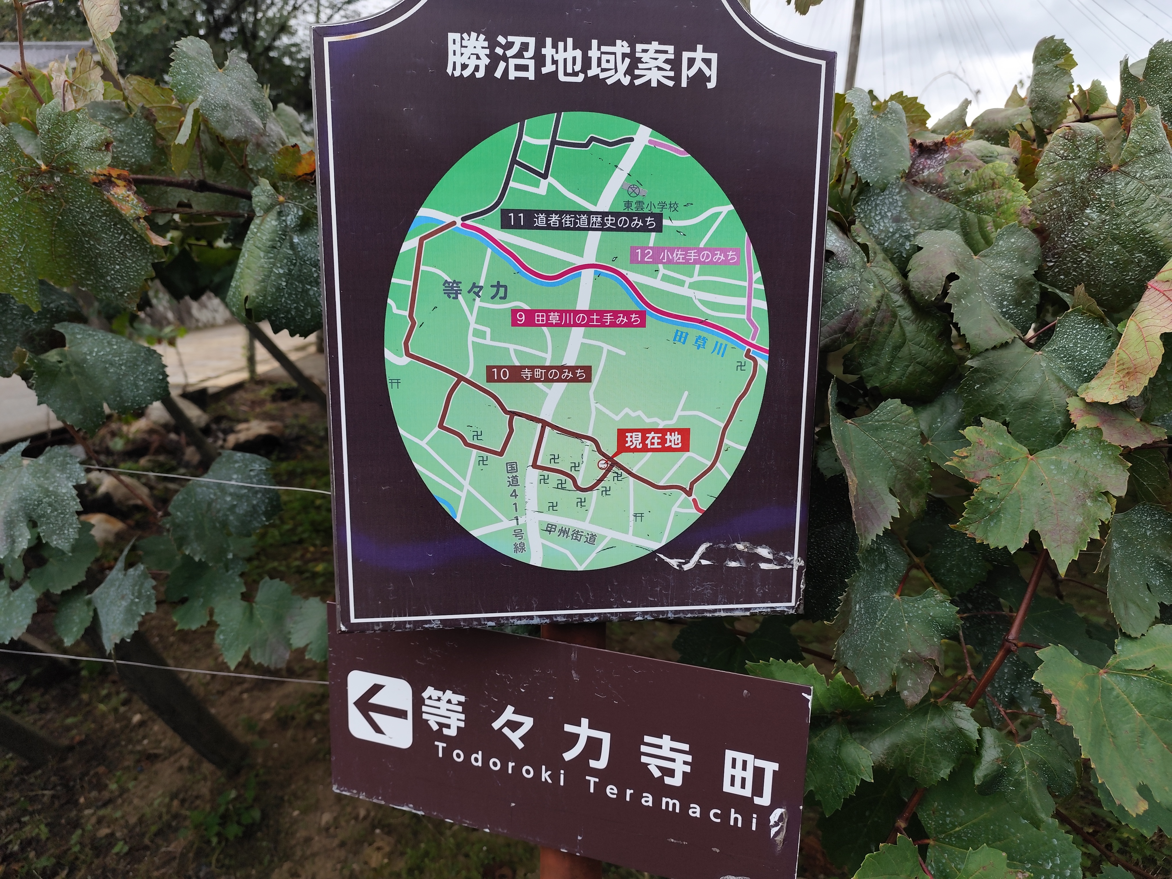 ちなみに、マップアプリの某先生で勝沼ぶどう郷駅から徒歩のルートを検索した場合、「等々力寺町」には寺町小路の東側から入るルートを案内される。