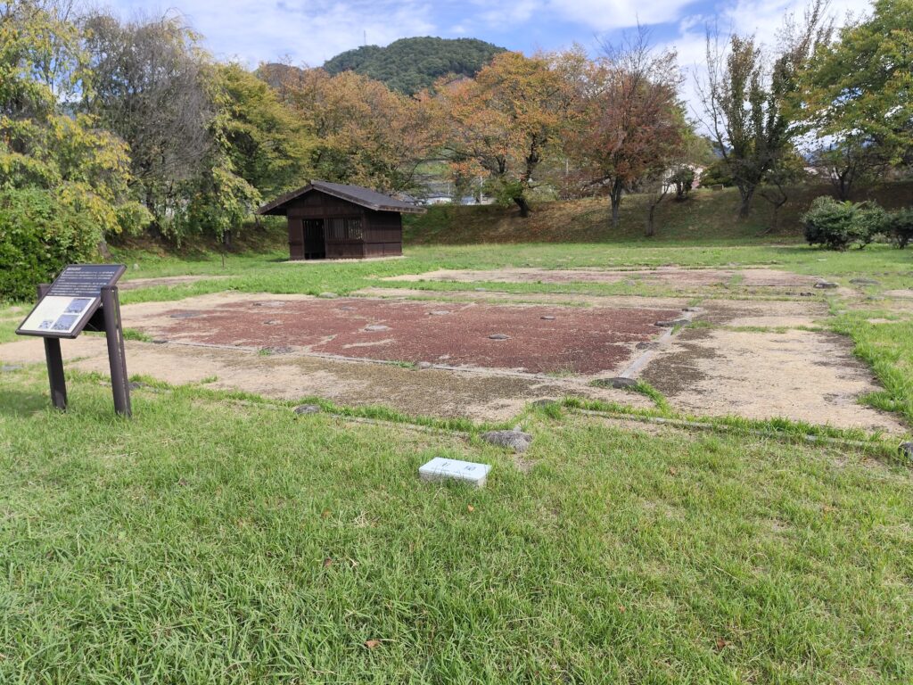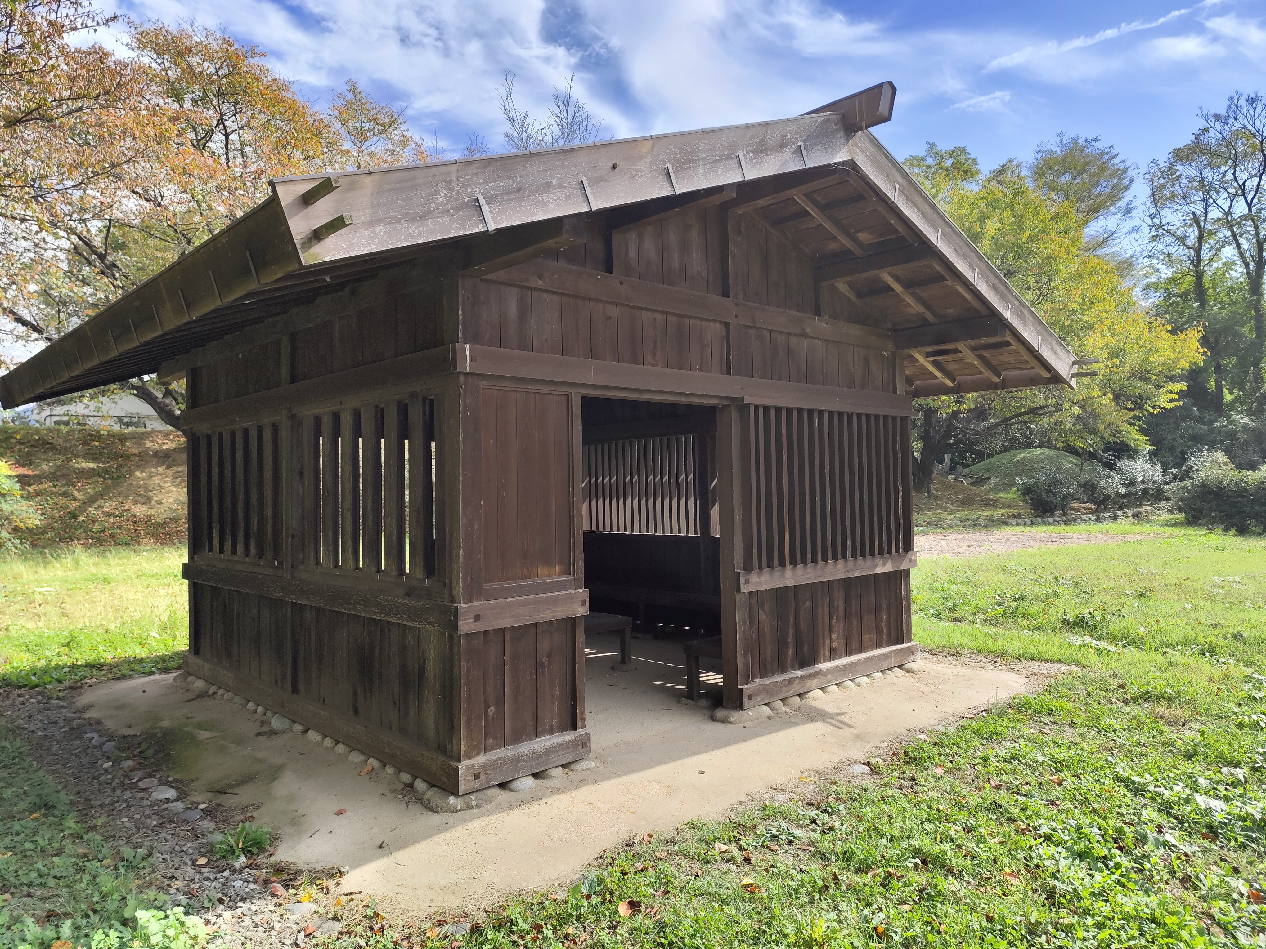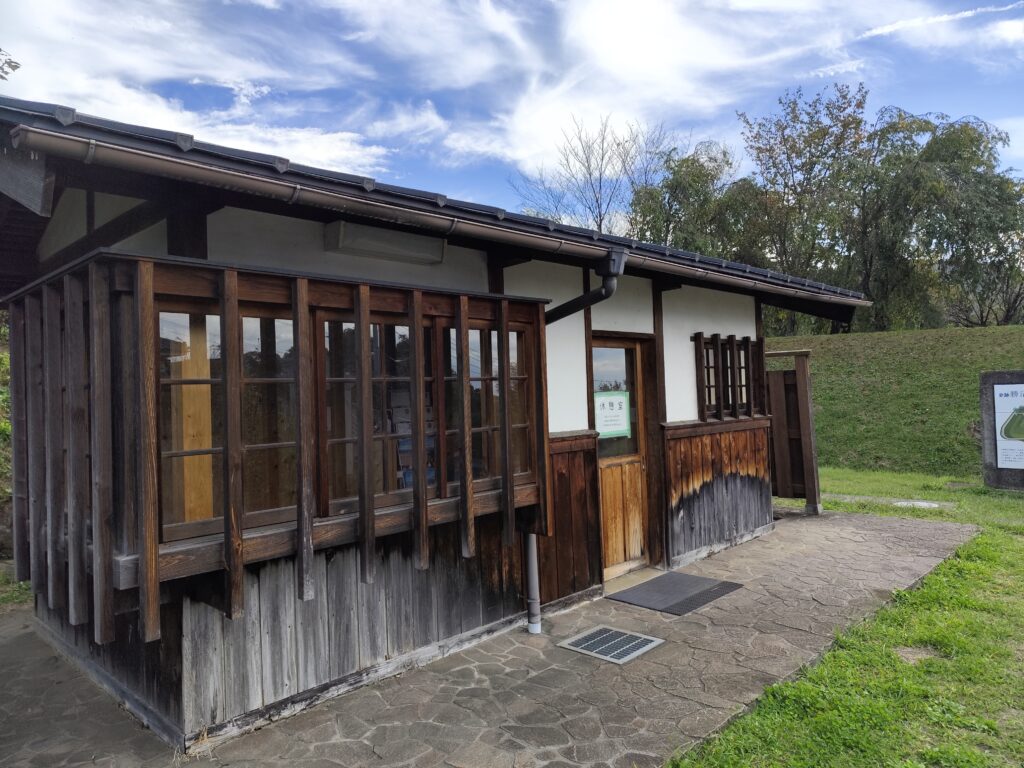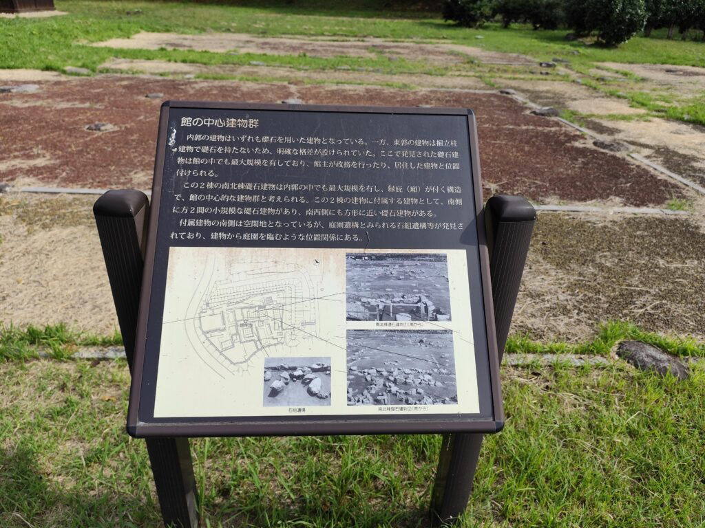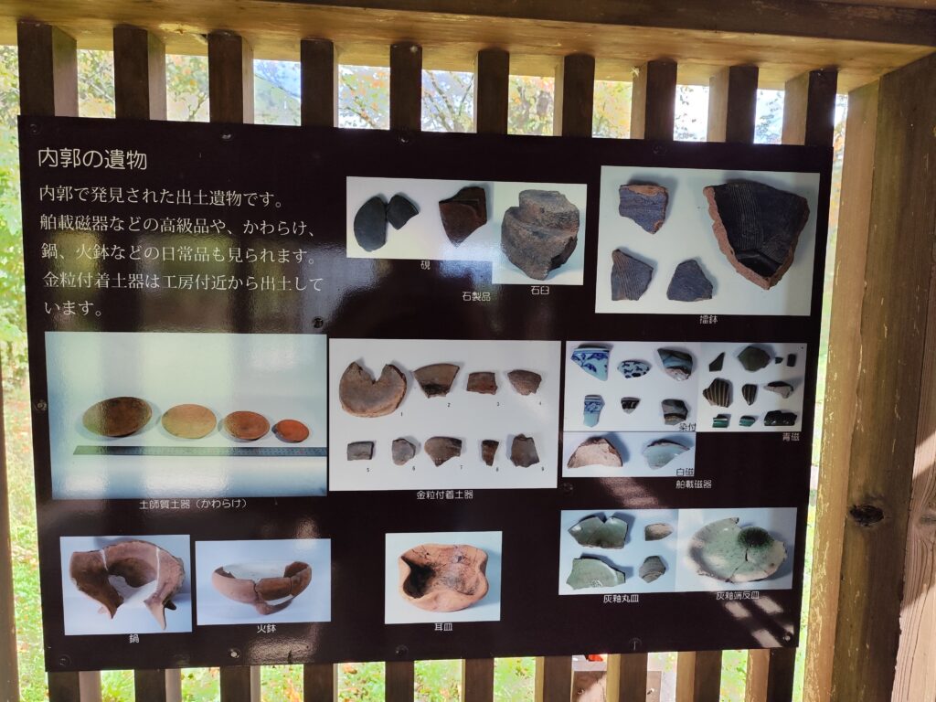また、主屋の近くには休憩所があり、こちらには内郭の遺構や遺物に関する案内板がある。