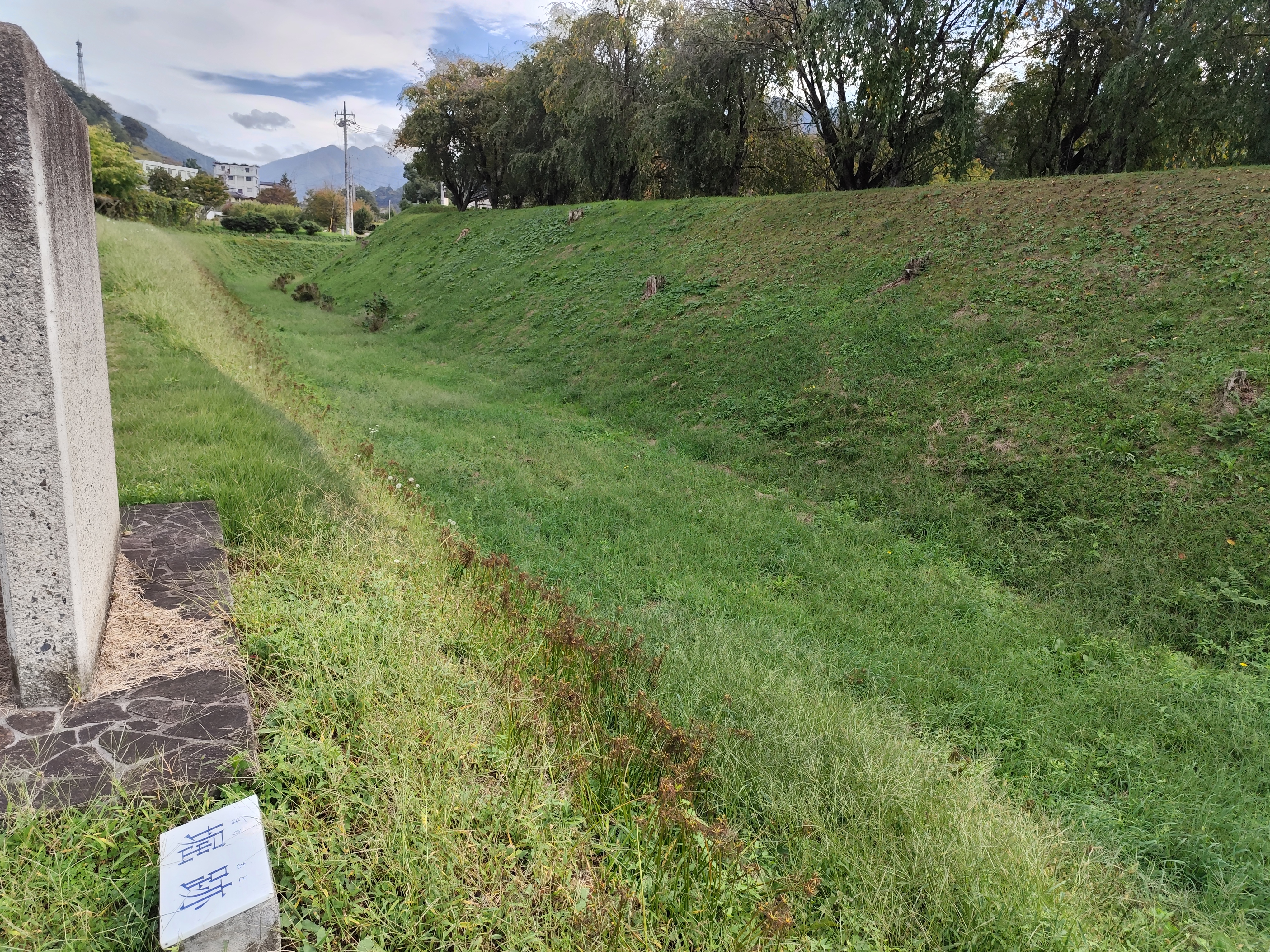 県道34号から敷地内に入り、休憩室を過ぎたところでまず目に入ってくるのが堀の跡だ。そもそも、こんな丘の中腹に堀がある景色がワタシには珍しかった。