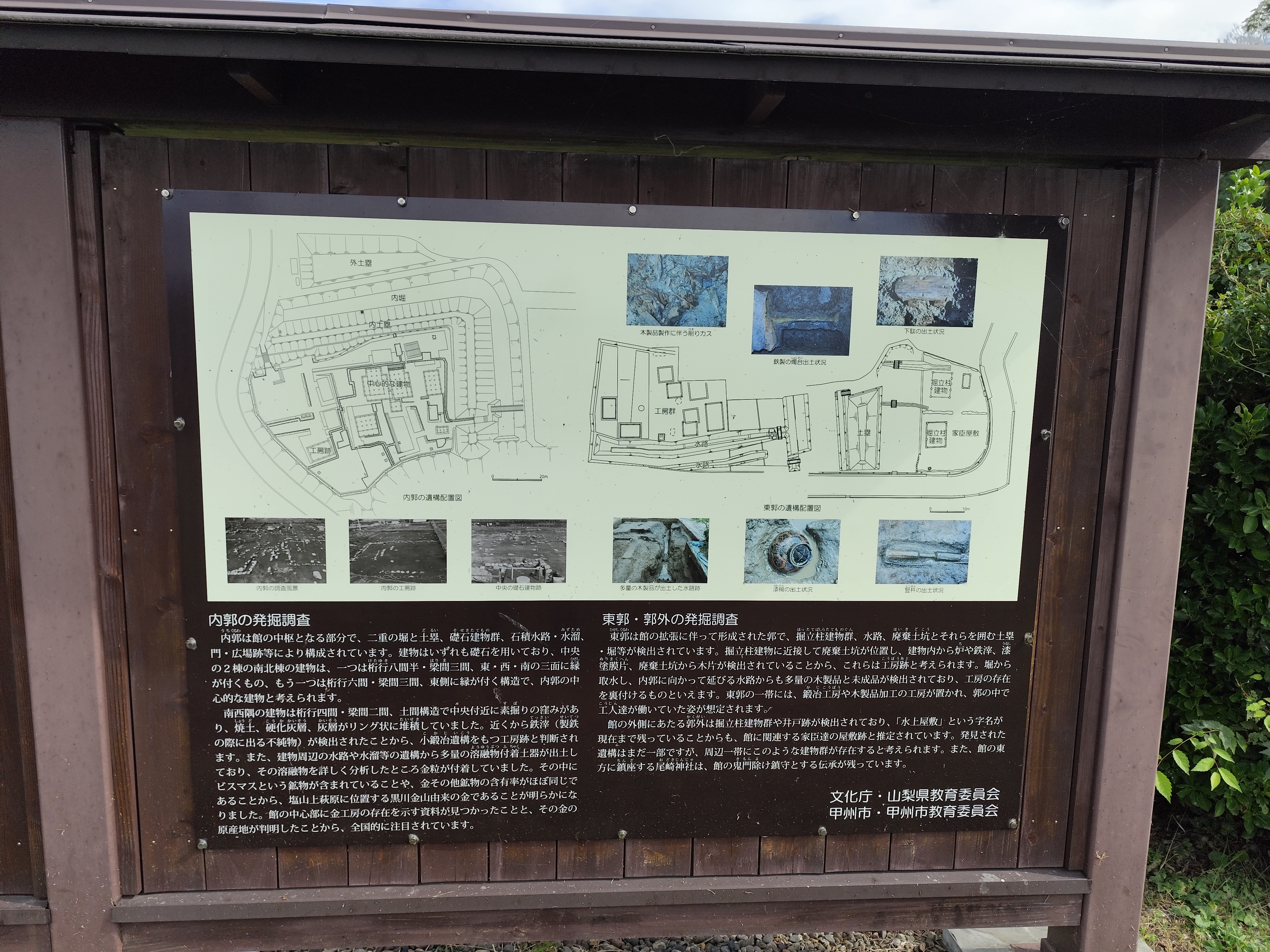 戦国時代の15~16世紀、武田信虎の弟である信友が勝沼衆を率いて拠点にしたといわれる居館の跡。天文4年(1535)に北条氏との戦いで信友が落命したあとも武田氏の重要拠点とされ、今井氏といった重臣が統治。江戸時代の地誌「甲斐国志」にも「勝沼氏ノ館跡」として掲載されており、「御所」「加賀屋敷」といった地名が今も残る。昭和48年(1973)、居館の推定地に県立ワインセンターの誘致が計画された際に試掘調査をしたところ、礎石建物群や石積水路などの遺構、陶磁器の破片やかわらけといった遺物が発見され、昭和52年(1977)まで断続的に調査。現在、内郭と呼ばれている館跡の中枢部分の配置などが明らかになった。昭和56年(1981)には国史跡に指定。