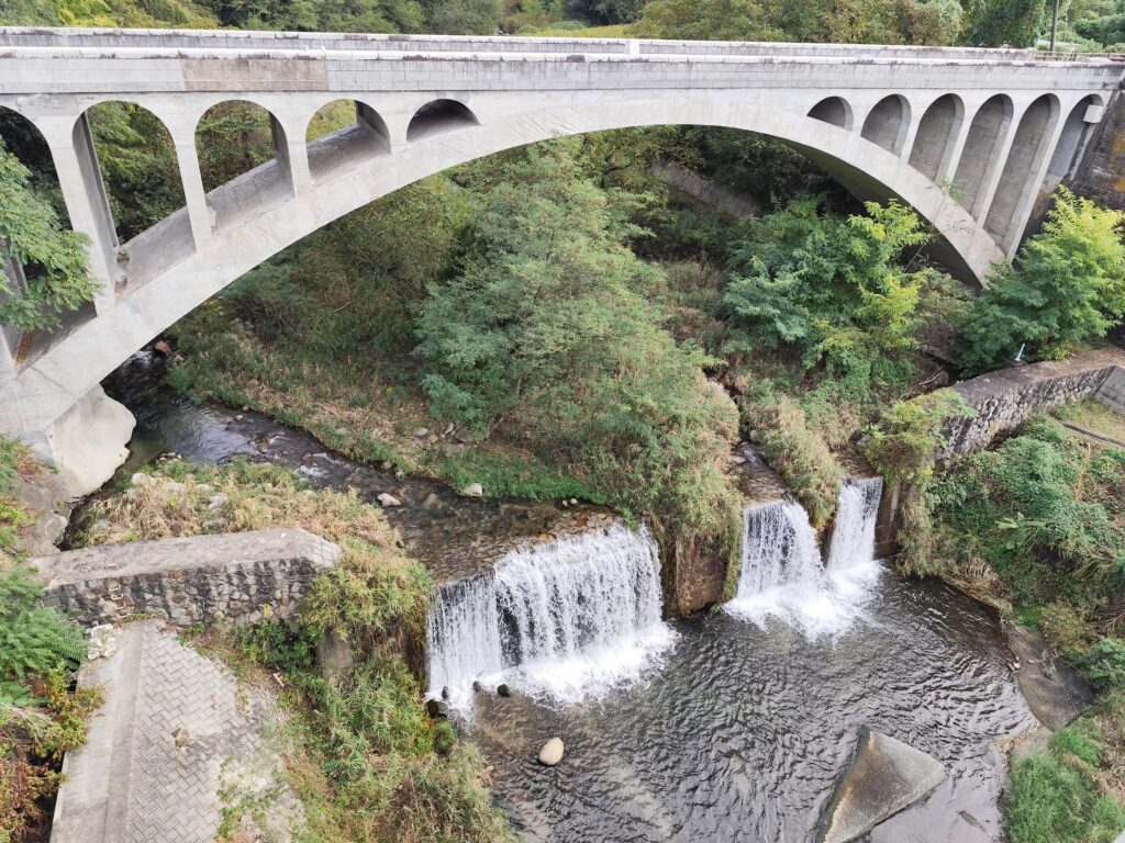 「眼鏡橋」という愛称を持つ、勝沼町のシンボルとして親しまれている橋。大正2年(1913)に勝沼駅(当時)が新設され、大正3年(1914)に祝つり橋が架けられる。昭和5年(1930)には祝つり橋の老朽化のため、橋長58.6m、幅員5.0mのコンクリートアーチ橋が架けなおされた。それが現在の祝橋である。昭和60年(1985)には祝橋の西側に橋長153m、幅員12mの新祝橋が架けられたことで、祝橋は道路橋としての使命を終了。平成9年(1997)には国の有形文化財に登録され、現在は歩道として保存が図られている。