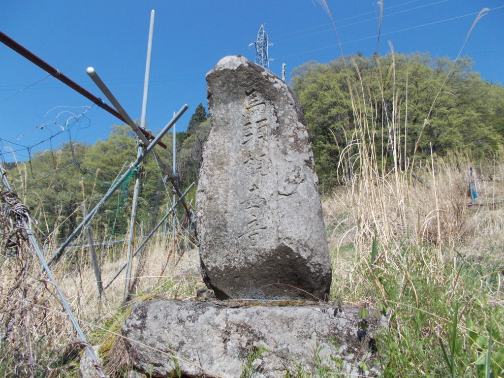 笛吹川に架かる一之橋を渡らず、川の西岸をそのまま北上してみると、道の両側に木がうっそうと茂る中にいきなり石碑と廃屋が。この廃屋がかなりのボロさで、先制パンチを食らった気分だった。