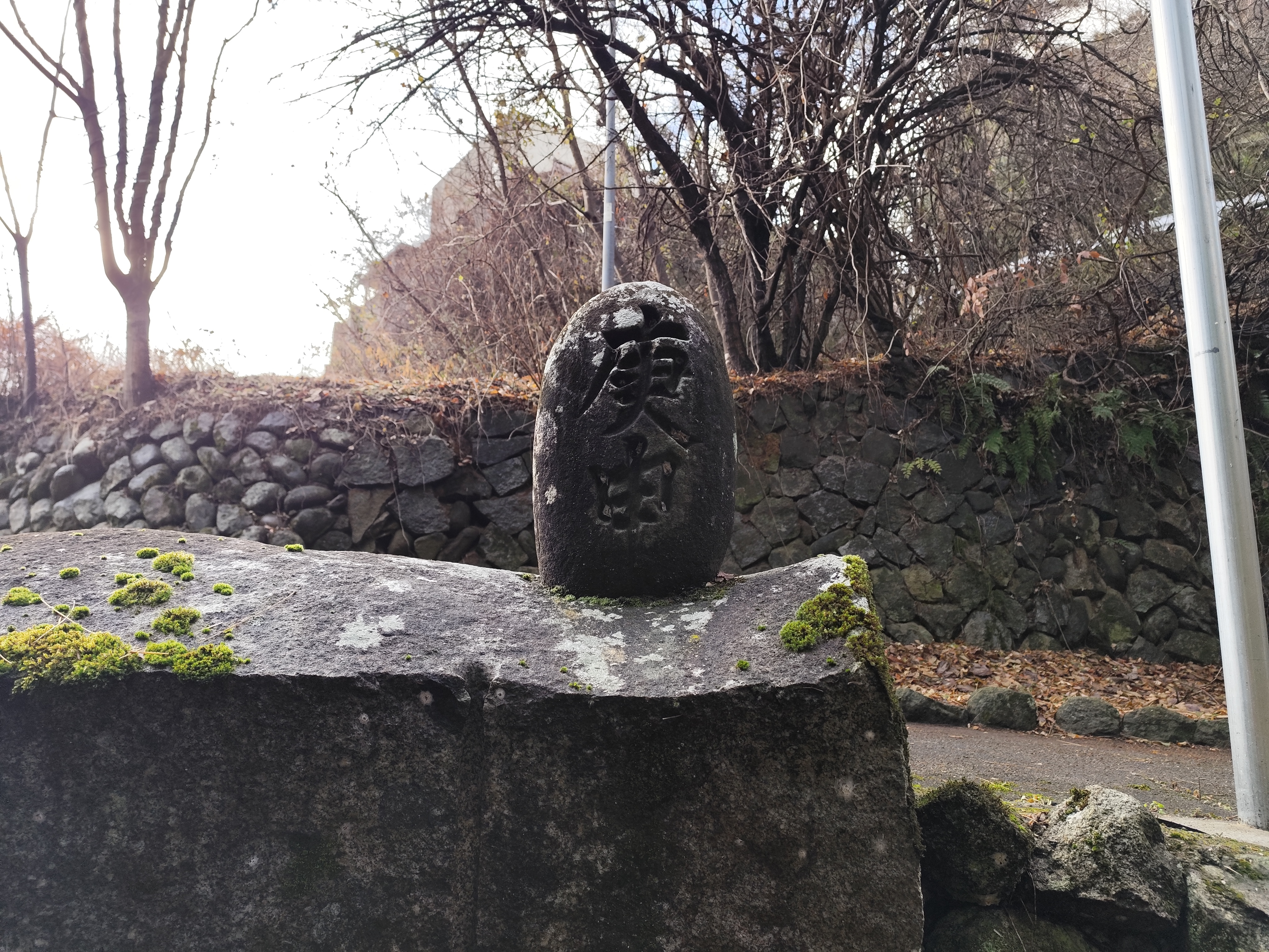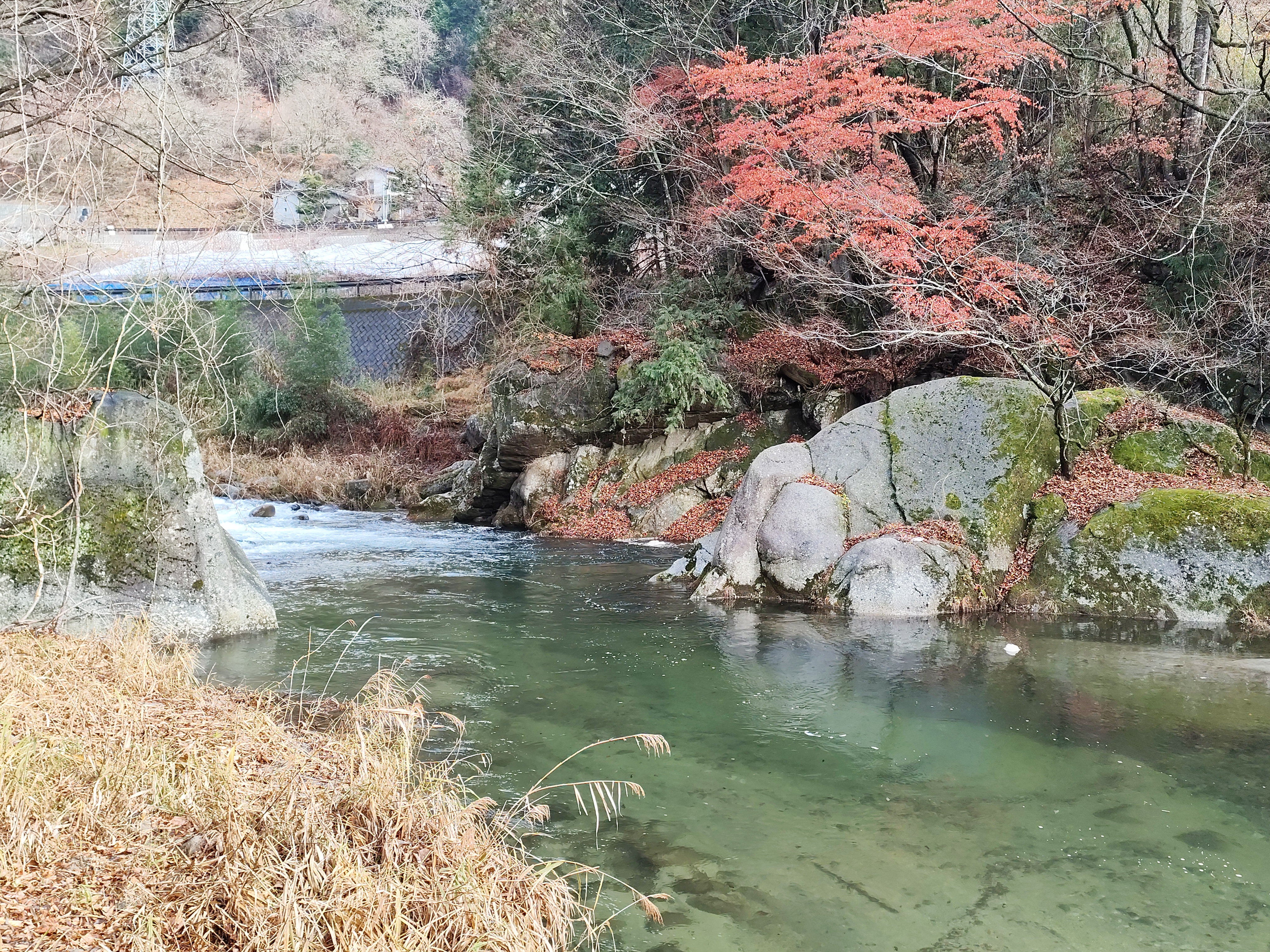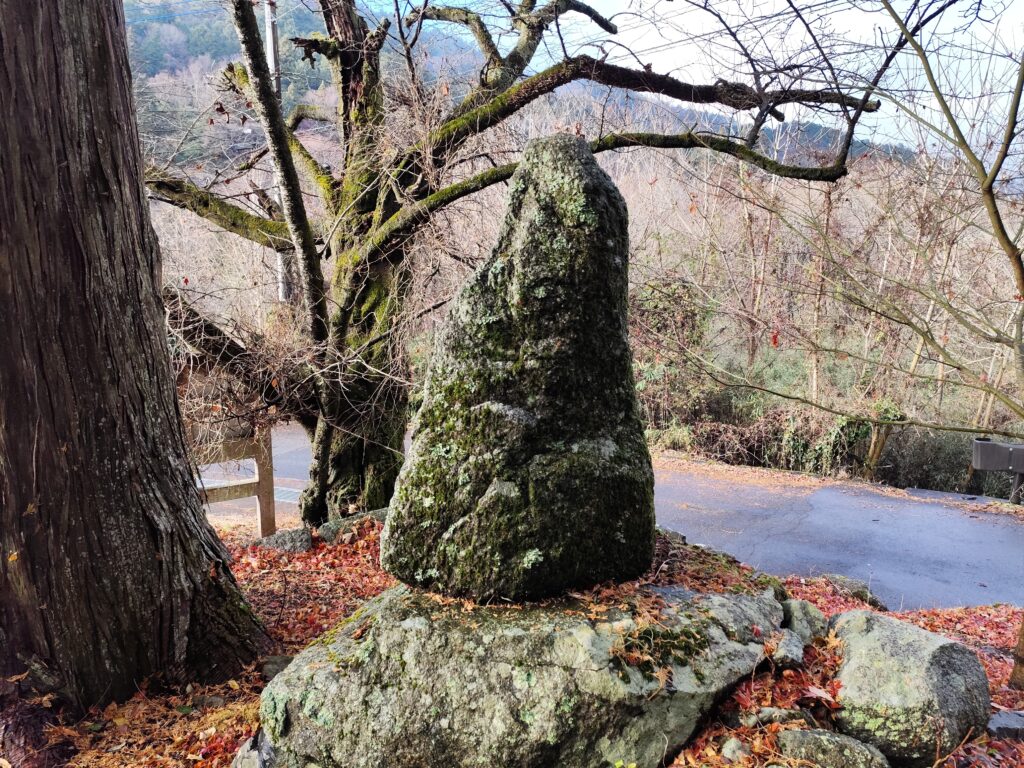 また、川沿いの道にはところどころに古い石碑も立っていて、ちょっとした歴史と自然を楽しめる散歩道といった風情だった。近くには「山王神社」、ずっと北に行けば「大嶽山那賀都神社」があり、もしかしたらこちらは巡礼者が行き来する道としてかつては栄えていたのかもしれない。