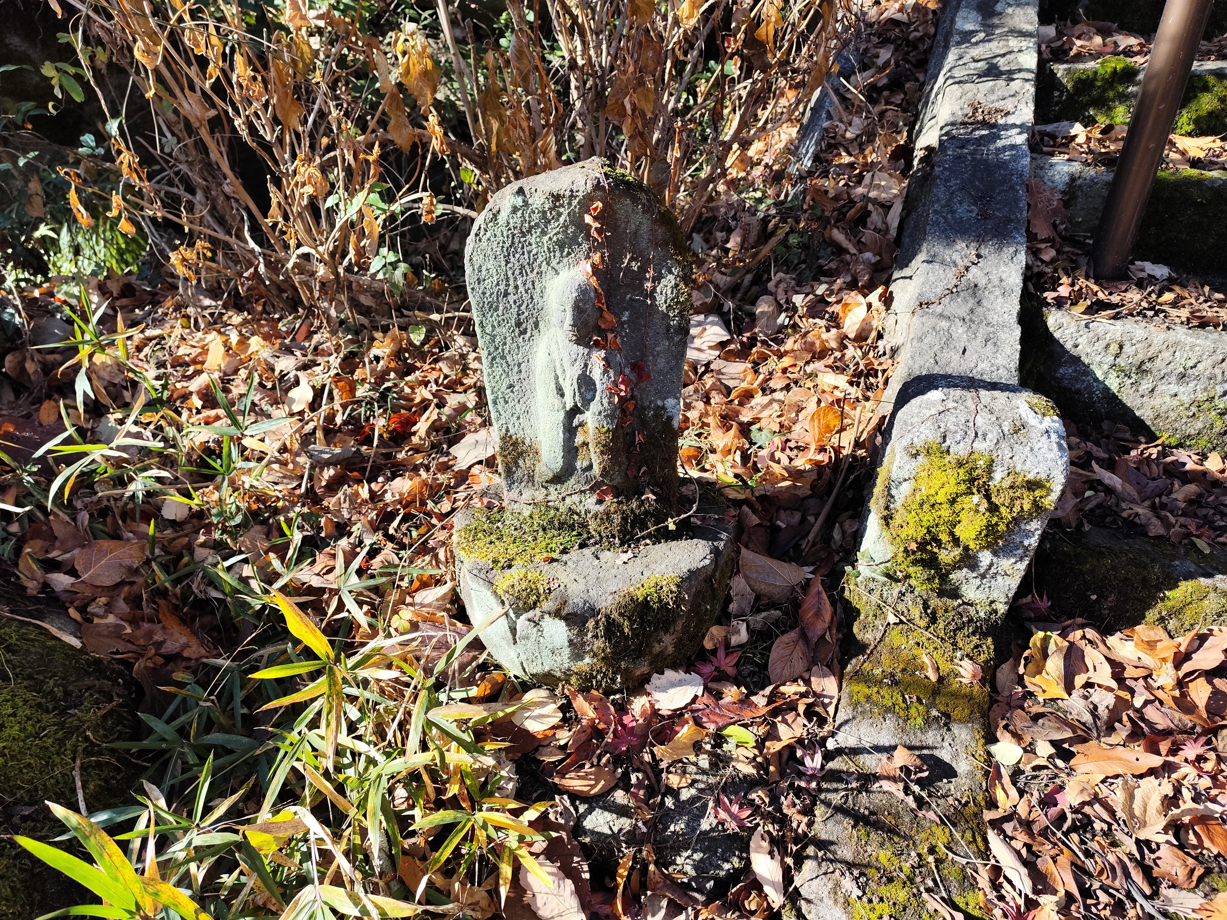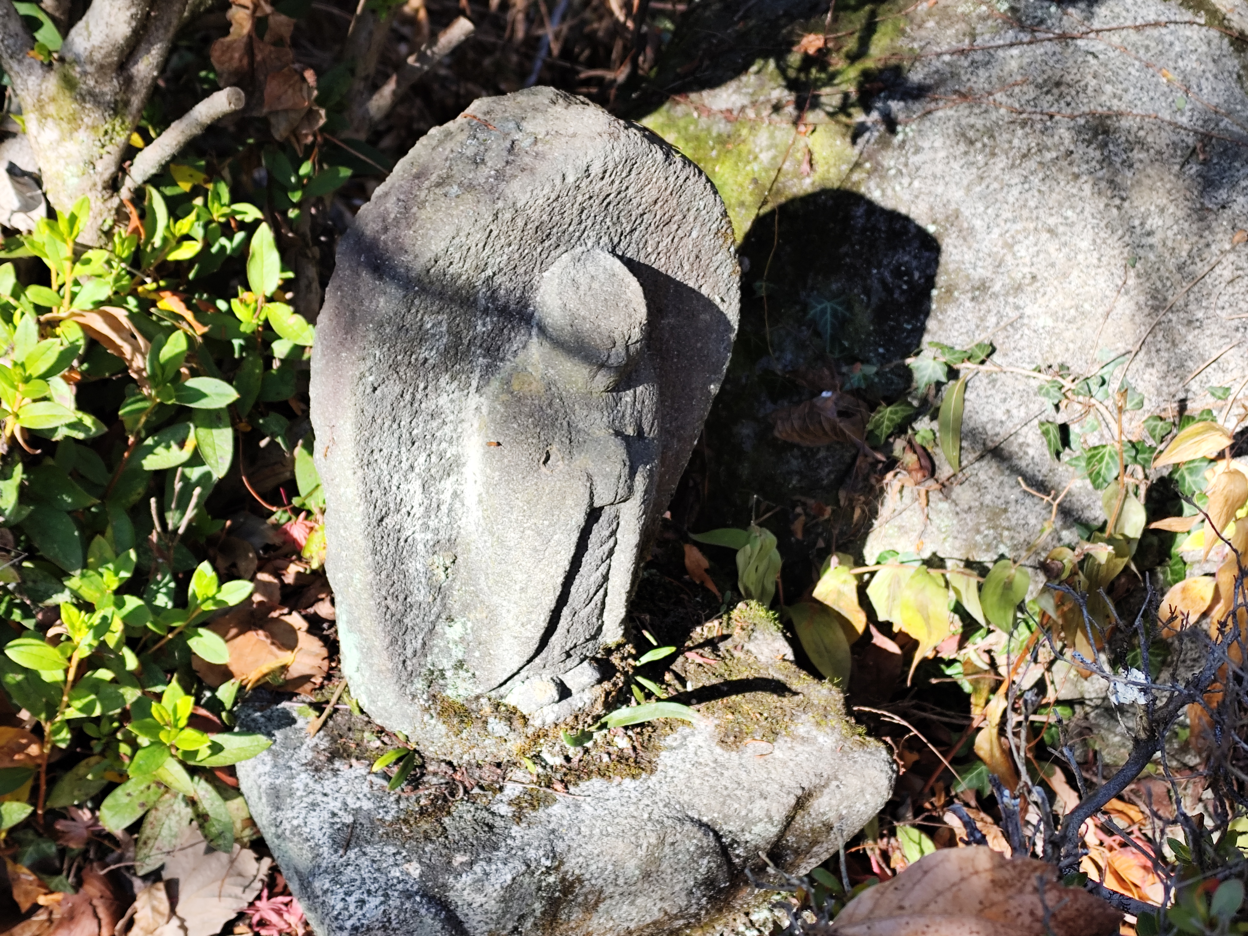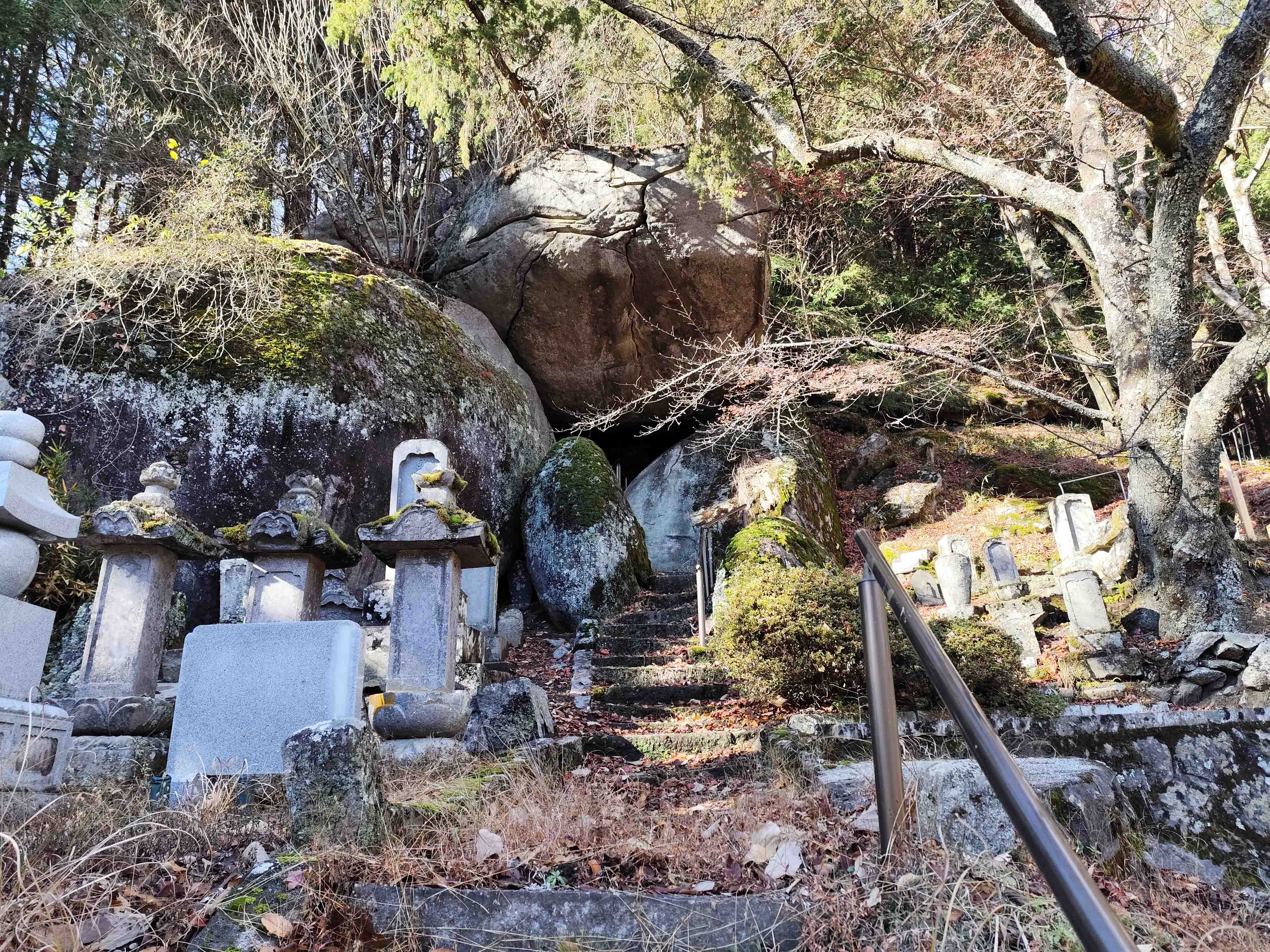 石段をしばらく上ると、墓石の向こうの斜面に苔に覆われた大きな岩がいくつも転がっているのが見えてきた。