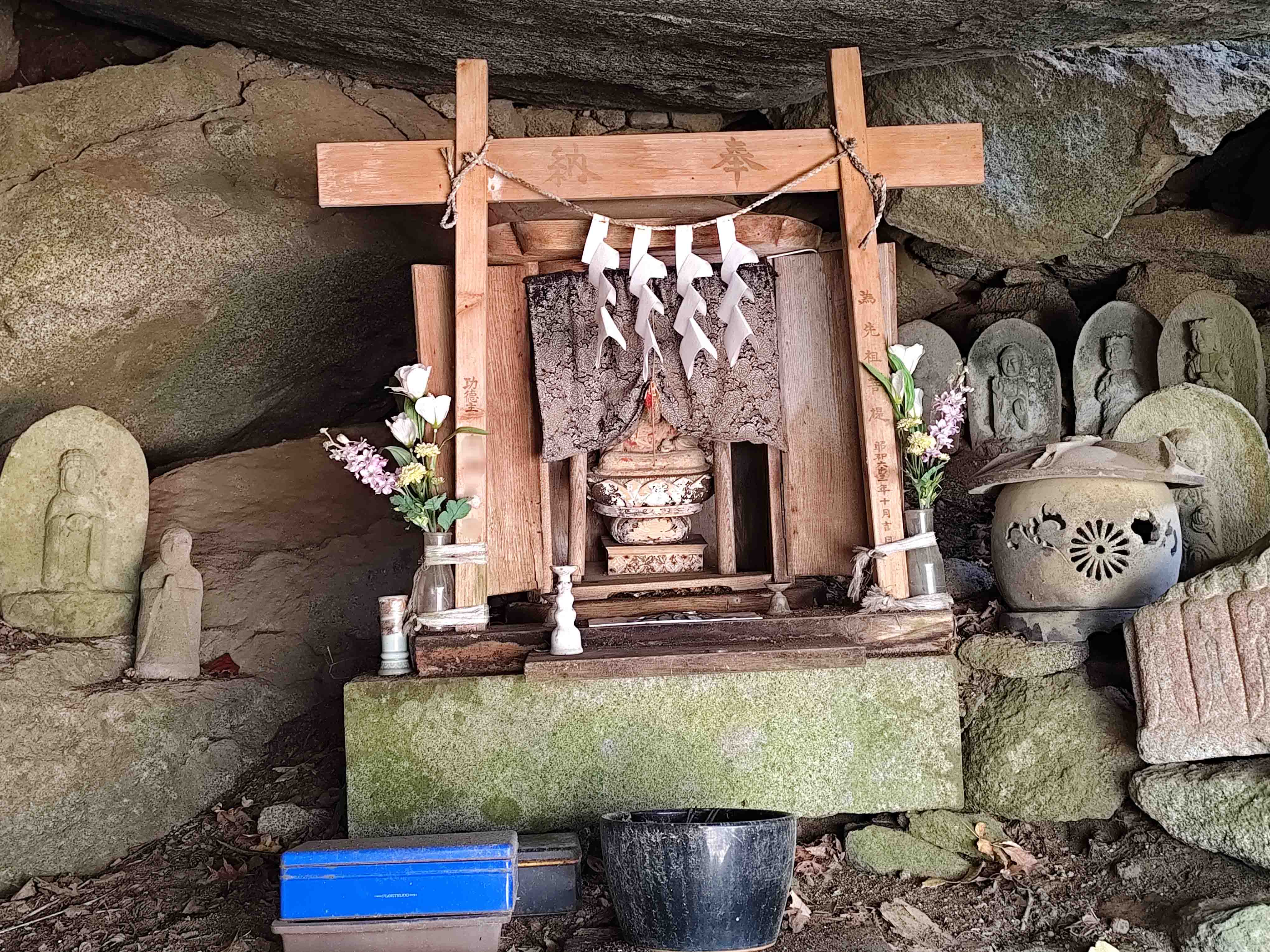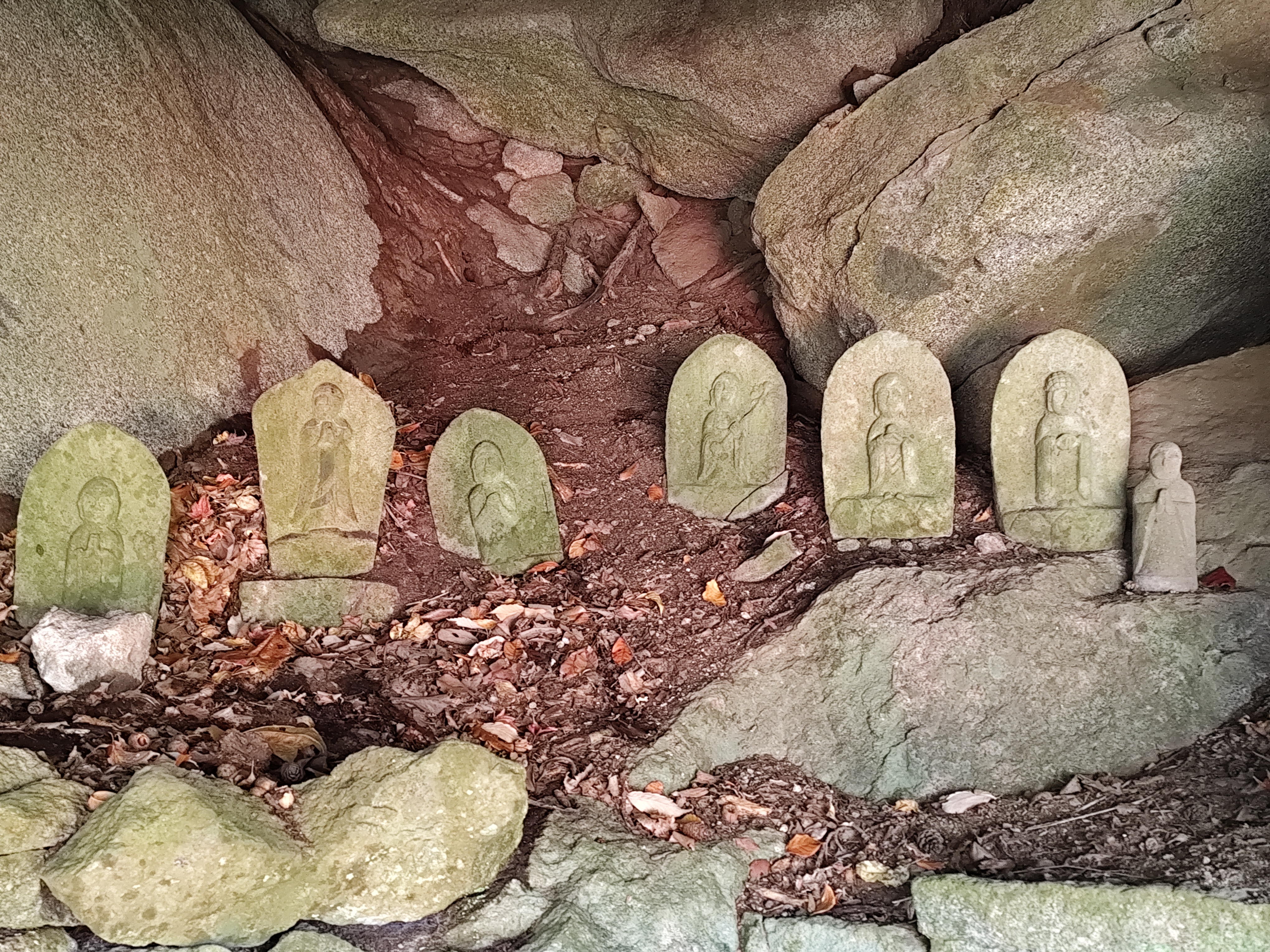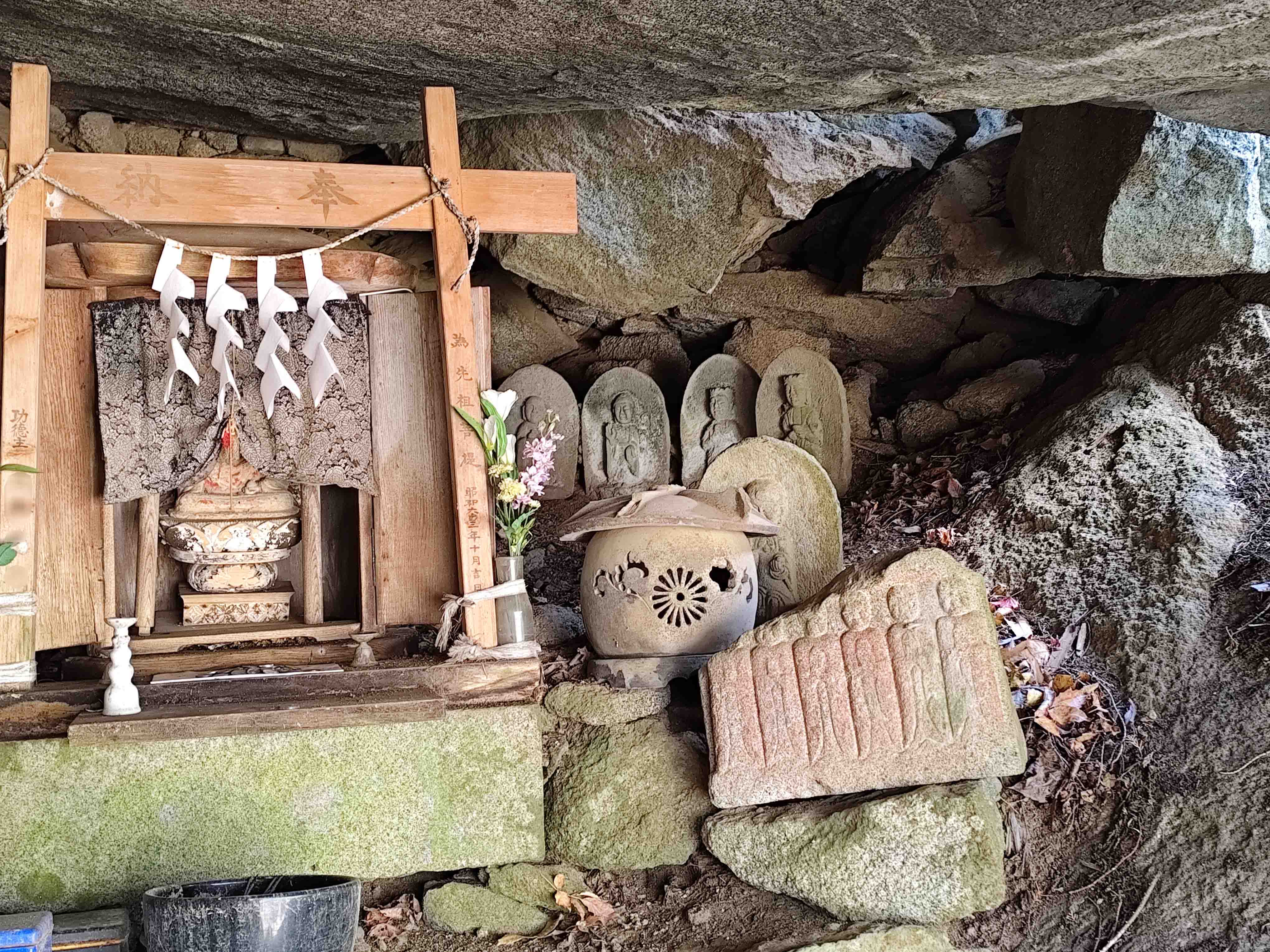 巨岩の下はちょっとした岩屋のようになっていて、そちらには小さな祠を中心として、やはり小さな石仏がたくさん並んでいた。