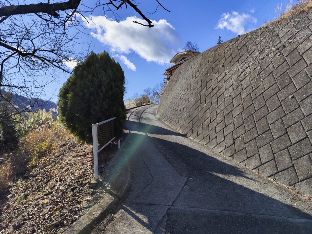 ただ、坂を上った先の景色はまるでどこかのお宅の庭のよう。さすがに入るのがためらわれ、坂が「く」の字に曲がっているところまでいったん戻り、マップアプリの某先生で道を確認する。