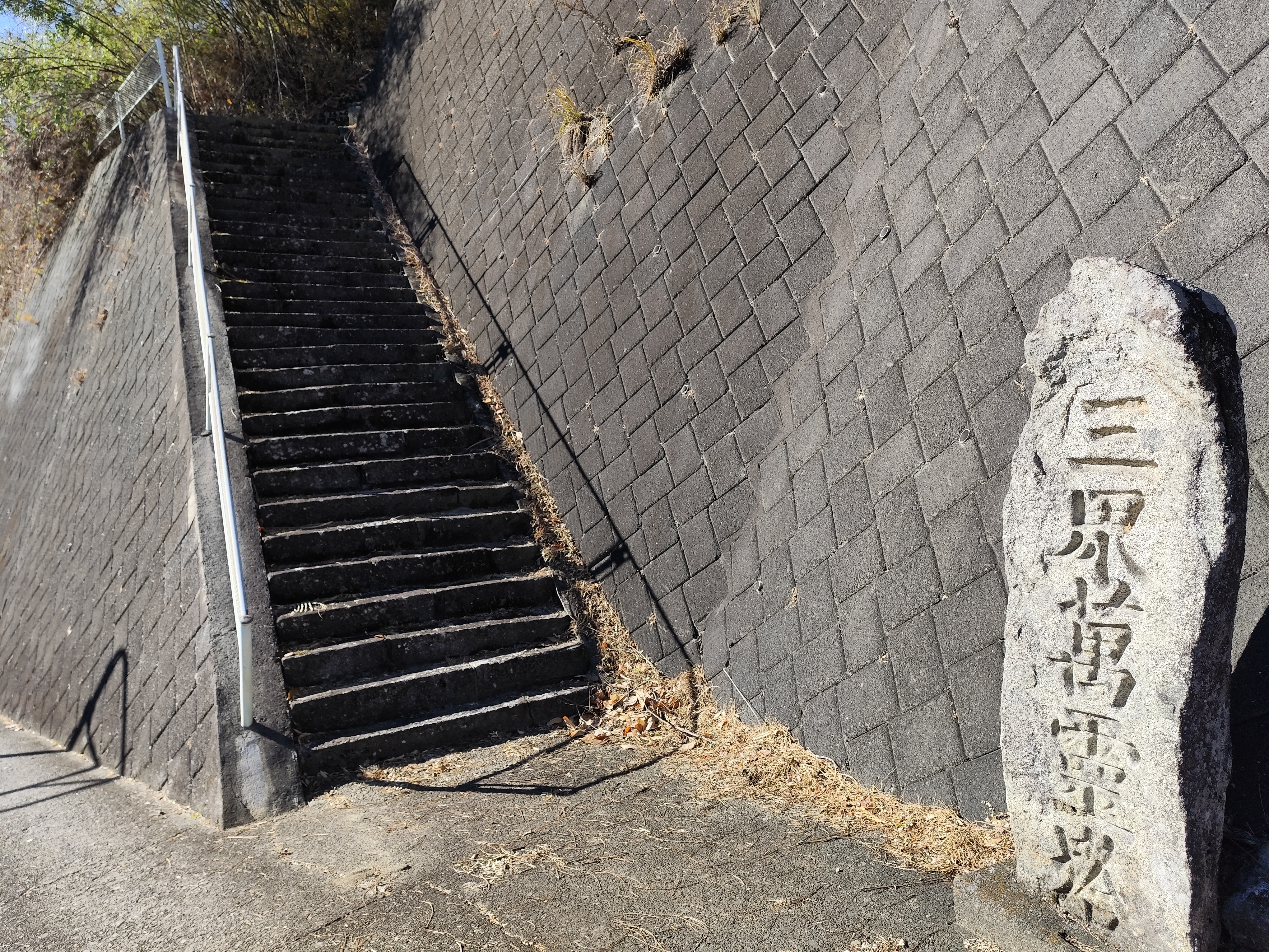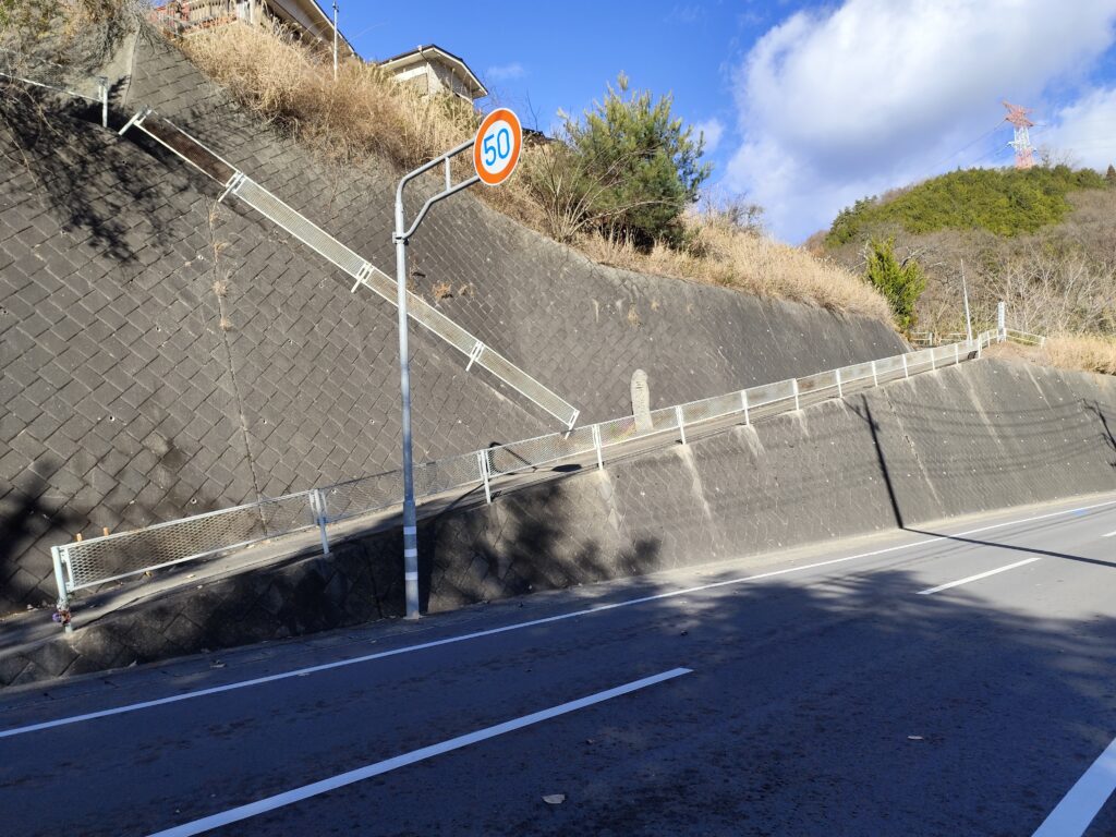 もうすぐ「廣蔵院」というところまで来たとき、国道沿いの大きな擁壁の上に柵が設置され、ちょっとした坂道になっていることに気づく。子どもの頃、よく高いところに登って遊んでいたワタシはためらうことなく坂道を上っていった。