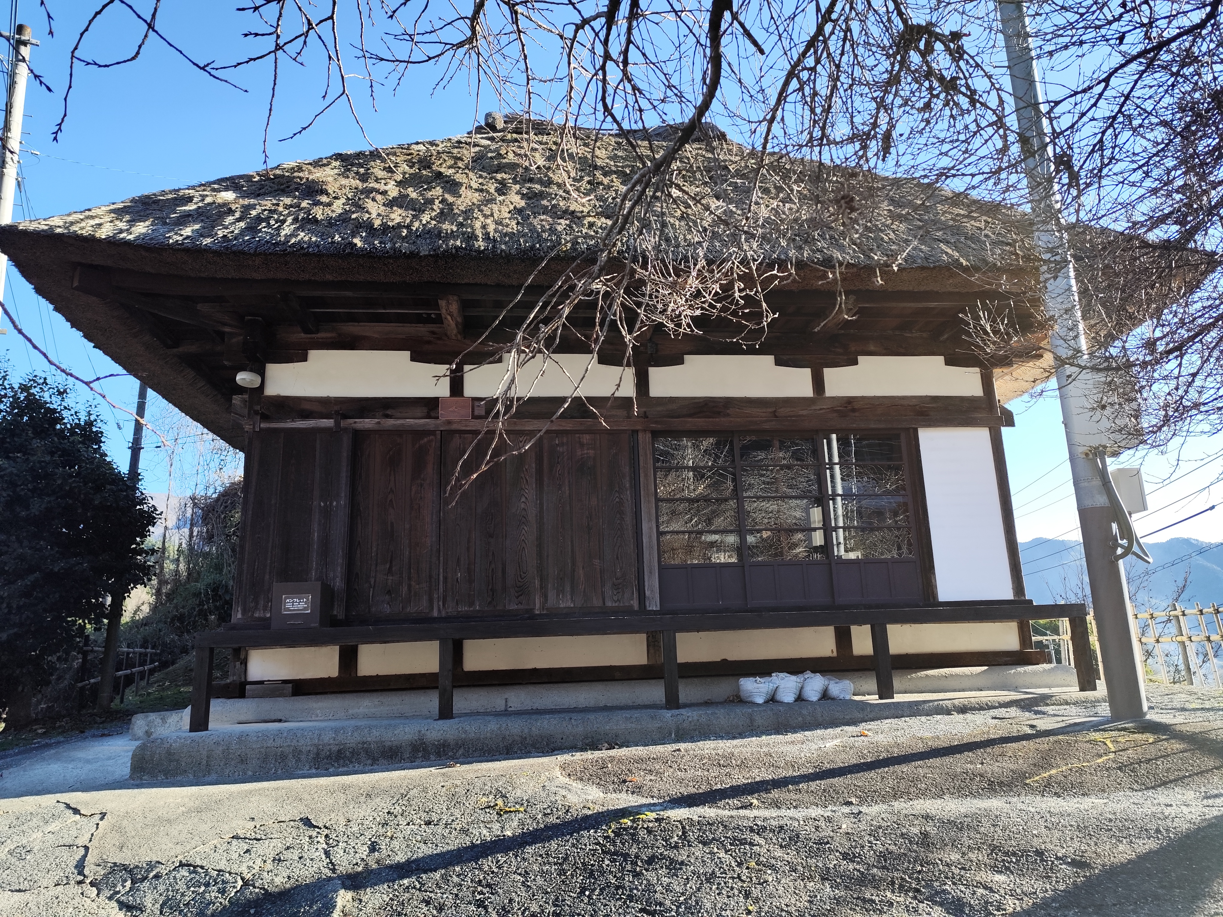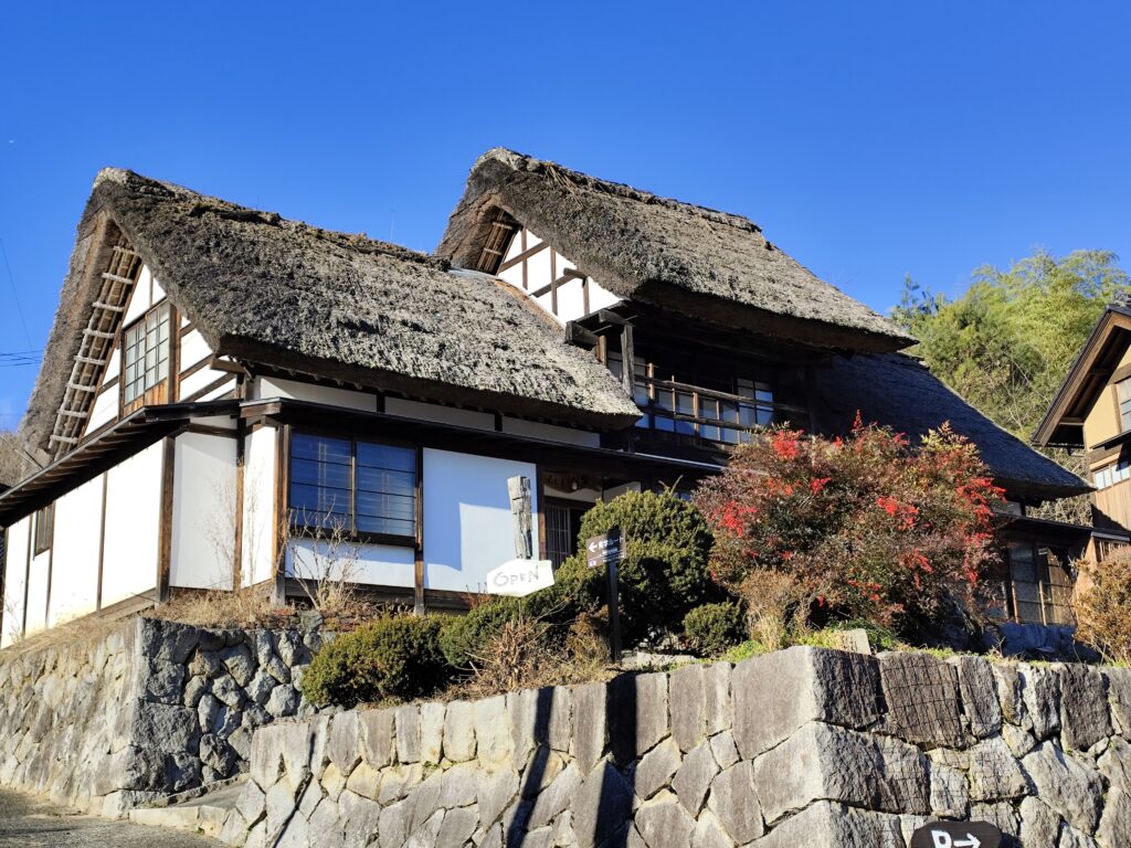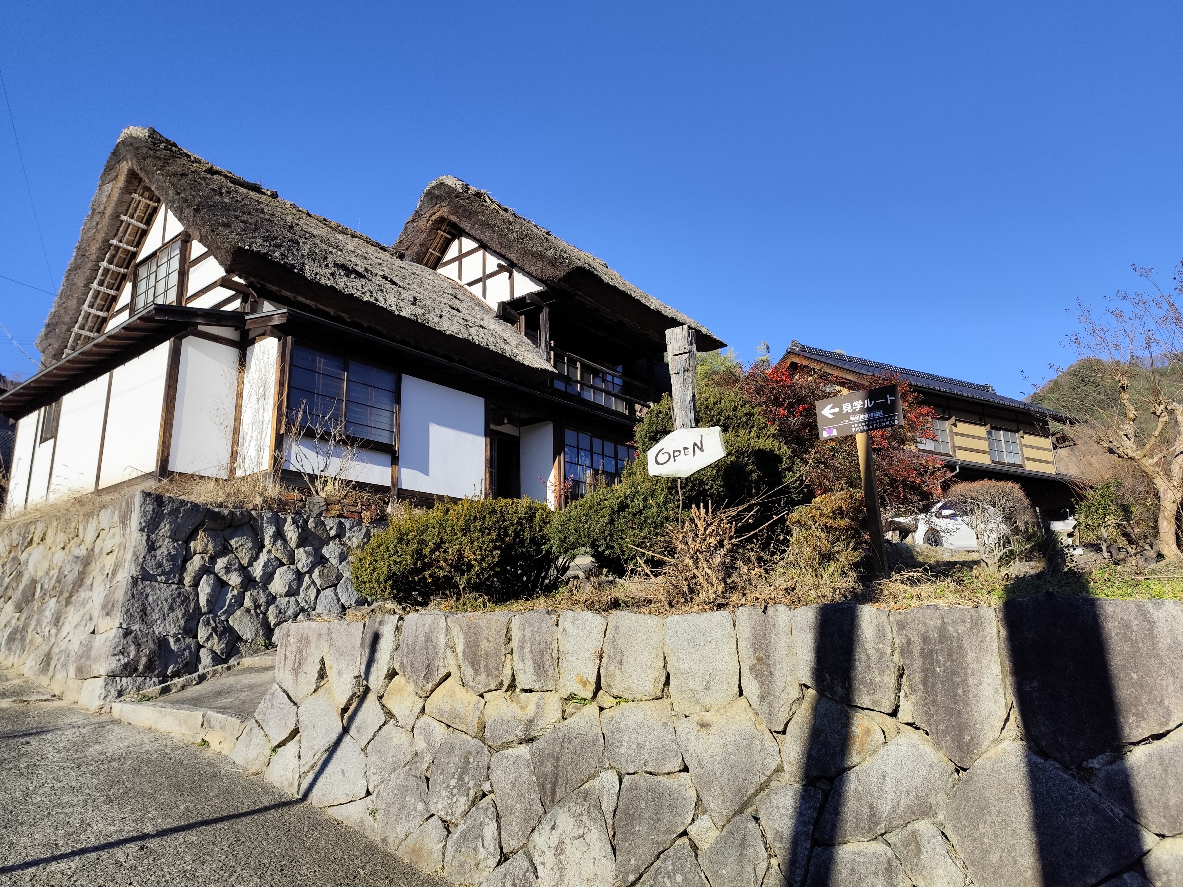 リーフレットを確認すると、このあたりは高台になっていることから上条集落でもオススメのビューポイントのひとつのようだ。実際、「ふくすけ型民家」とも呼ばれる茅葺切妻造りの主屋が何軒もある、他の地域ではお目にかかれない風景が広がっていた。