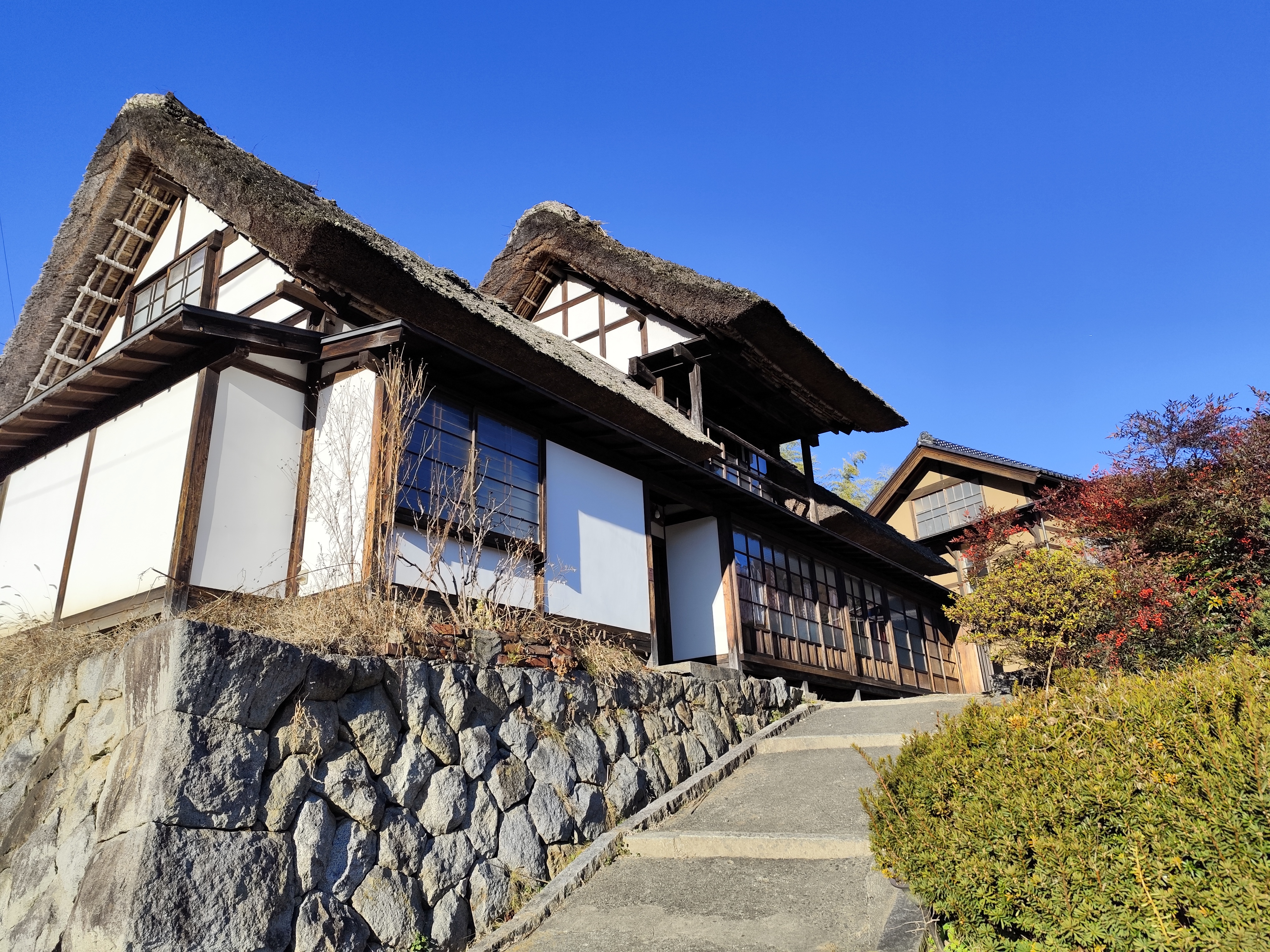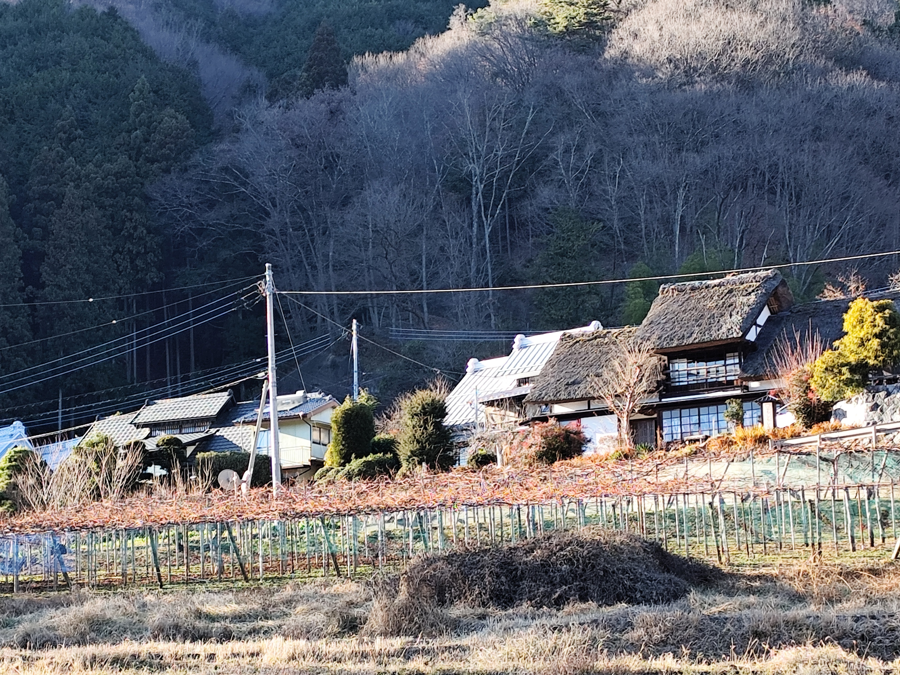 実は甲府盆地の峡東地域には、上条集落にあるような茅葺切妻造りの主屋が今もけっこう点在しているのだとか。今回の旅行中、同じような民家を確かに何度も見かけた。ただし、上条集落のようにひとつの地域にまとまって残されているのは非常に稀だという。