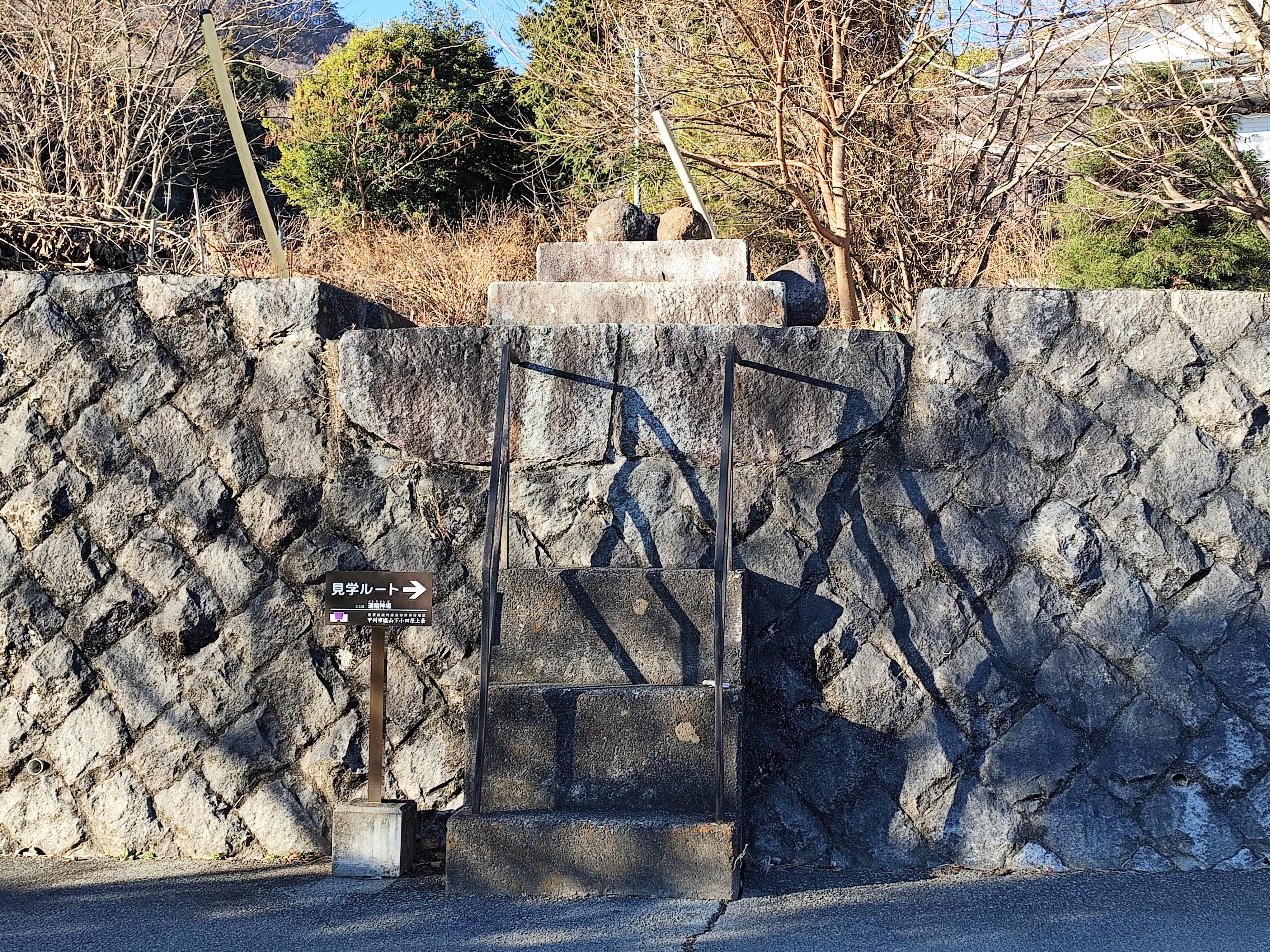 道祖神場はちょっとした擁壁の上にあり、近くで見るとしたら階段を上る必要がある。この階段は数段ながらかなり急なので、上り下りする際にはしっかりと手すりにつかまるようにしよう。