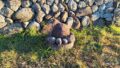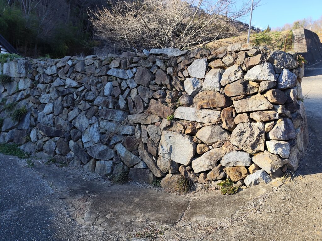 また、道祖神場のそばある石垣は、近くで手に入る石を積み上げて作られたものとのこと。どうりでいろいろな色や形をした石が交じっているわけだ。