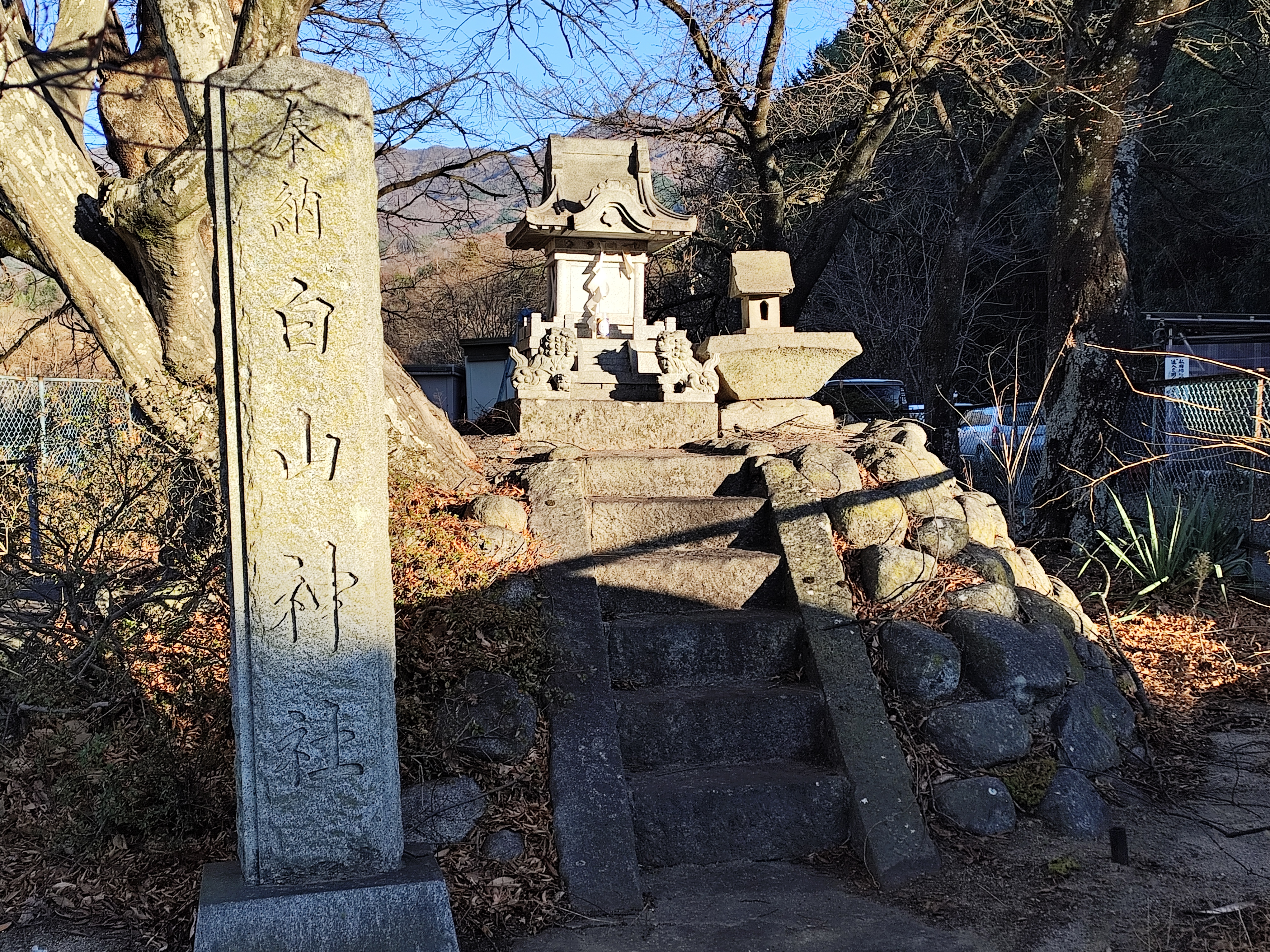 県道201号沿いの「白山神社」にあるのは石碑と石段、小さな祠のみ。