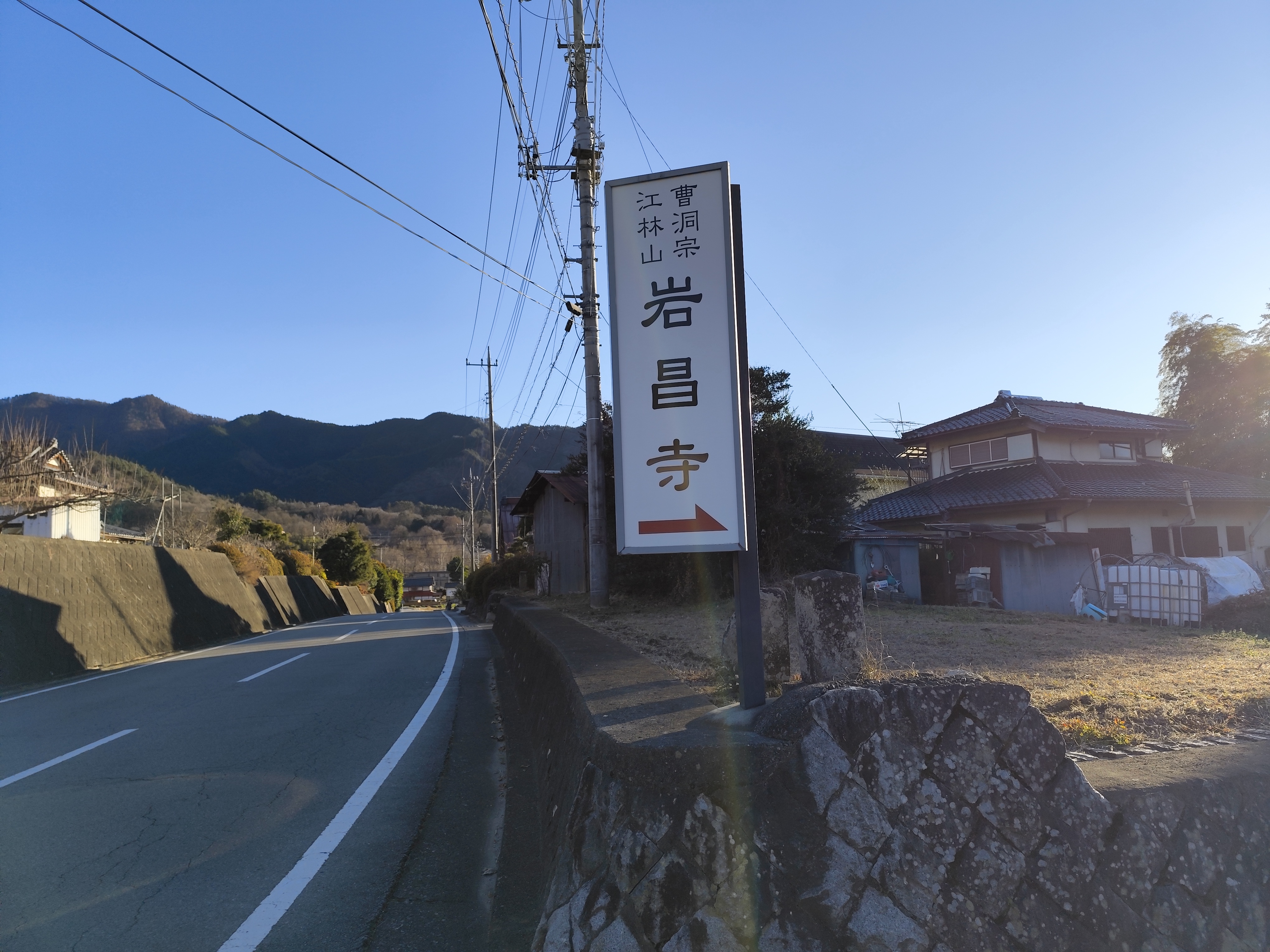 「白山神社」でお詣りをすませたあと、県道201号を歩いているとすぐに「岩昌寺」の案内板を発見。ワタシは案内板の指し示す脇道のほうに入ってしまう。