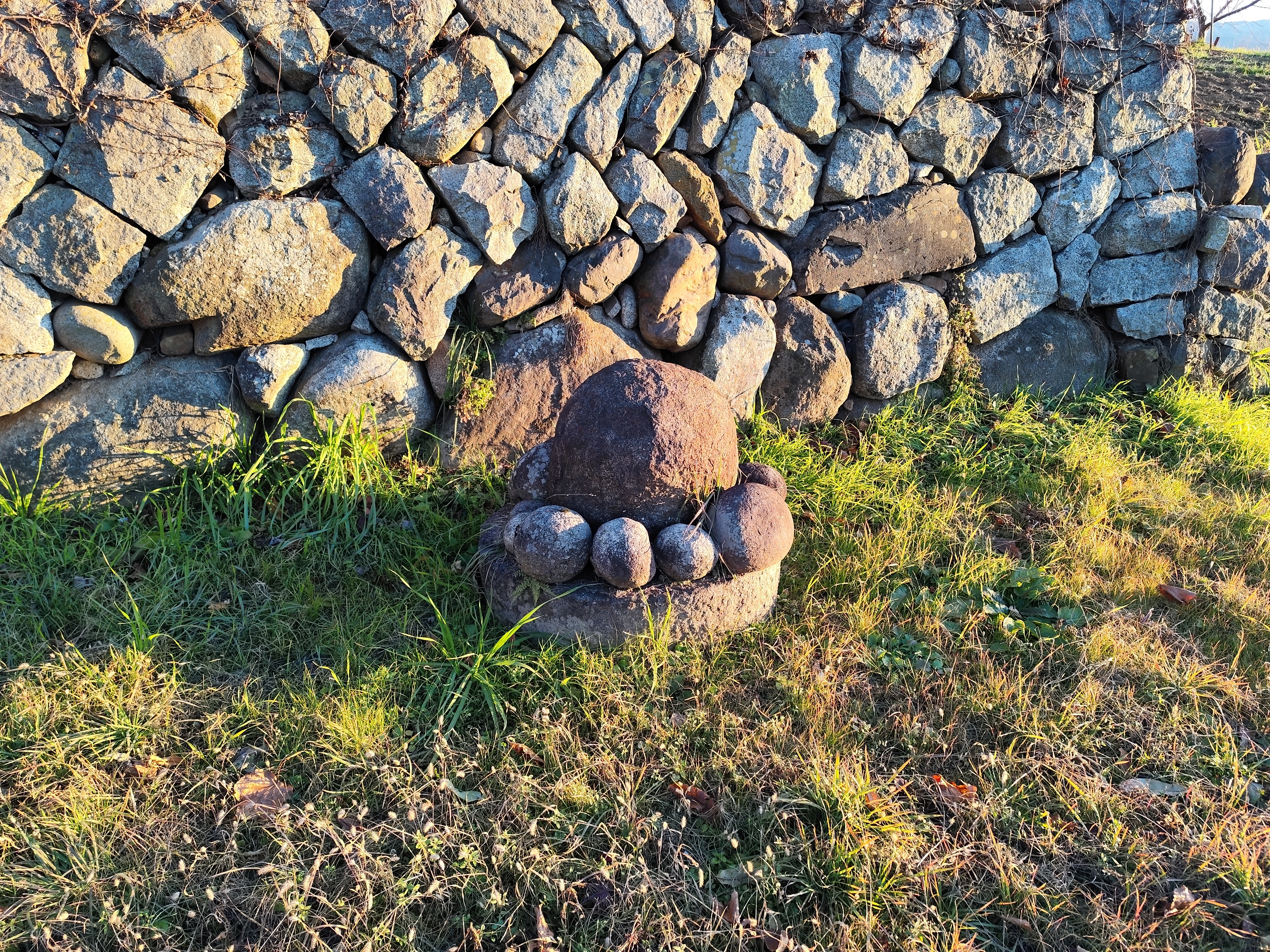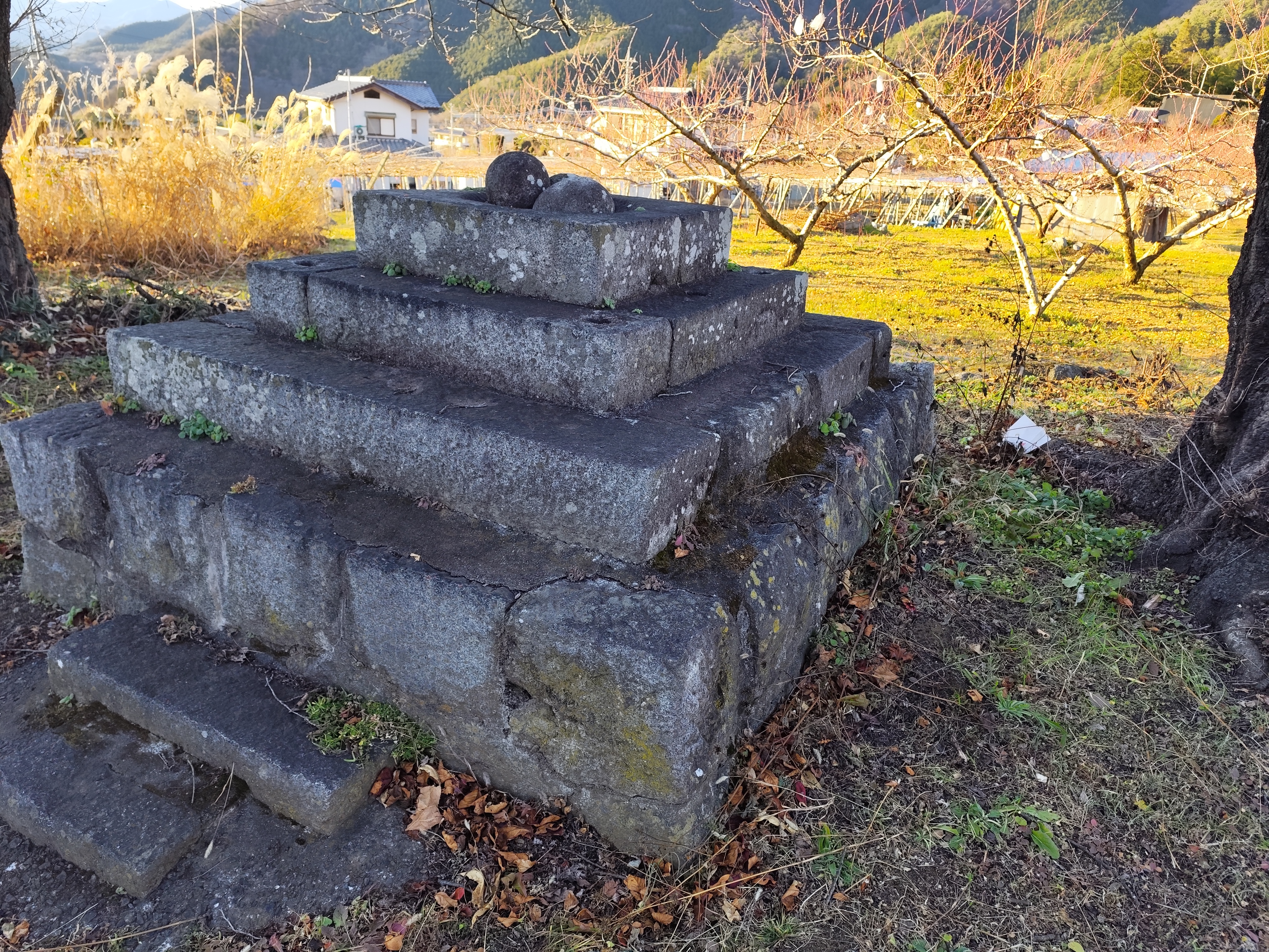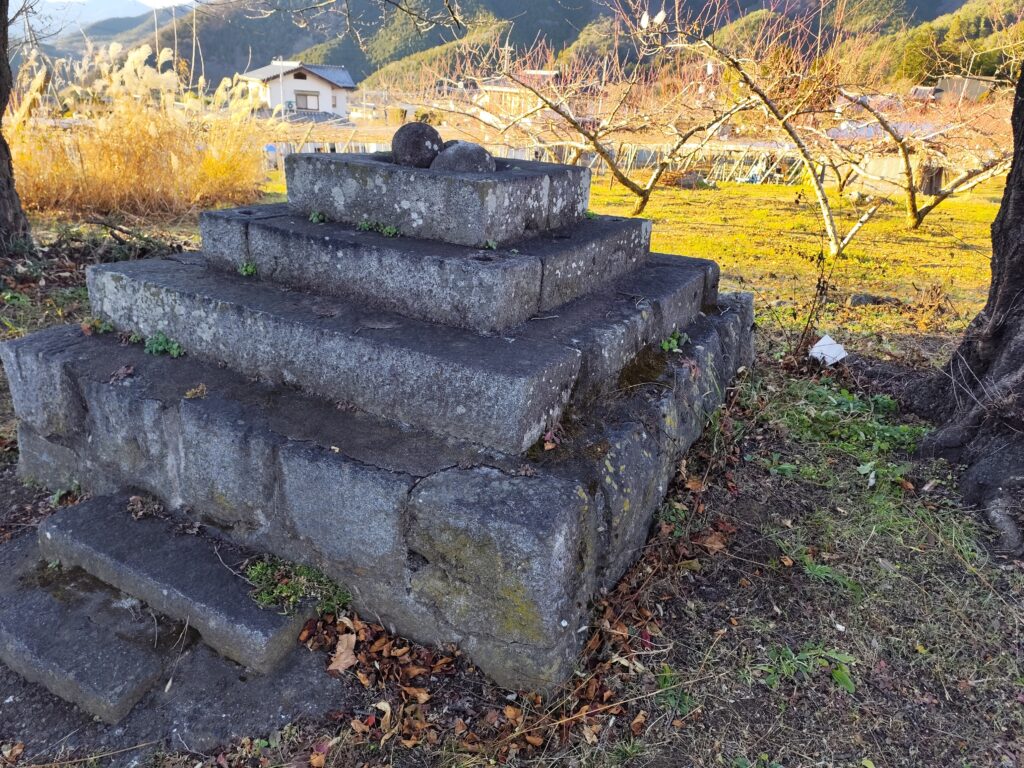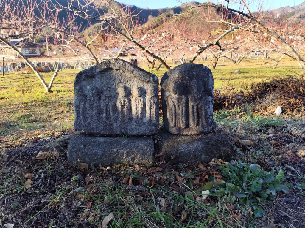 しかし、もはやワタシにとっての最優先事項は塩山駅に着くこと。着くことなのだが…道端に気になるものがあると、そちらに寄っていってしまう。「安道寺遺跡」の東側にあった道祖神を見つけたときもそうで、道端に何やら丸い石が積まれているので見に行ってしまった。