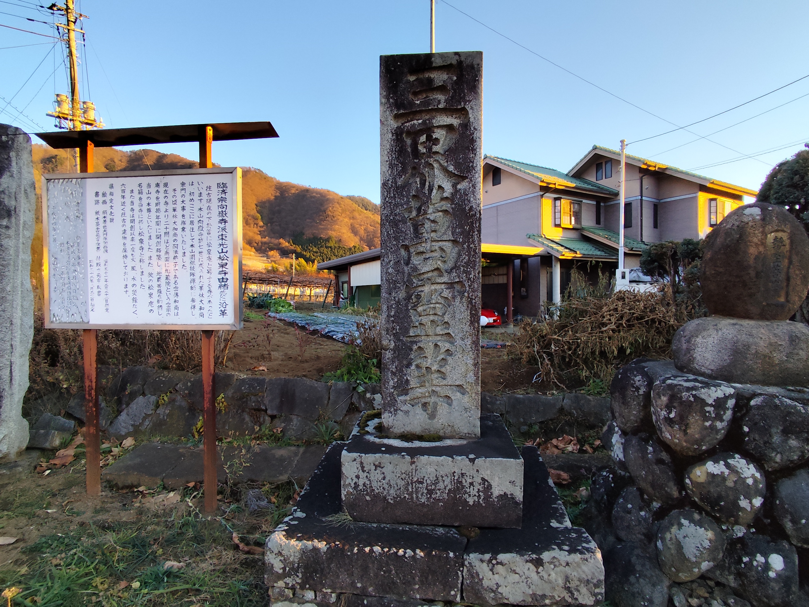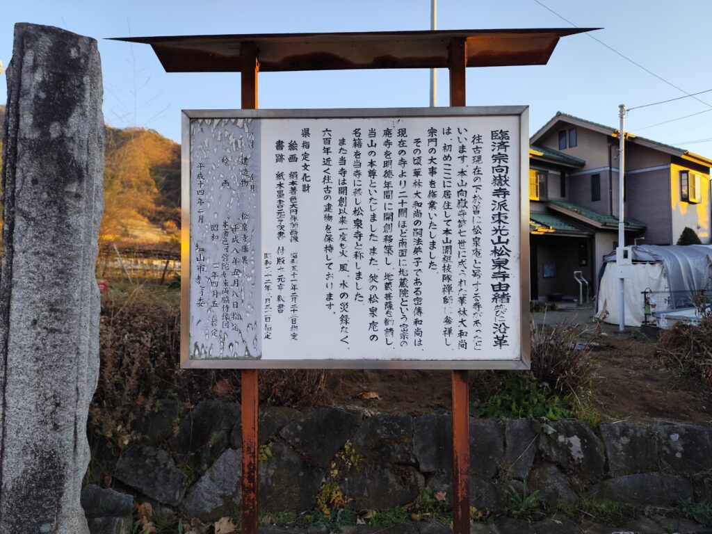 道祖神の写真を撮影してから数分後、今度は県道201号沿いで「松泉寺」というお寺の案内板を発見。「勢至菩薩」と刻まれた丸石なんて珍しいなぁ…と思うものの、頭が回るのもここまで。奥に「松泉寺」があるようだったが行く気力もないし、そもそも案内板の文章も頭の中に入ってこなかった。