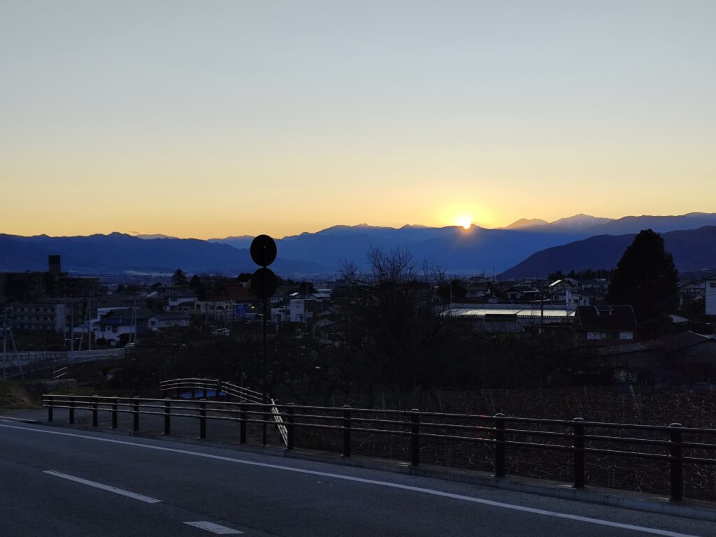 そろそろ17時頃という時間帯に、やっと塩山駅の近くまで到着。このとき、ちょうど西の山々の向こうに日が沈んでいくところだった。