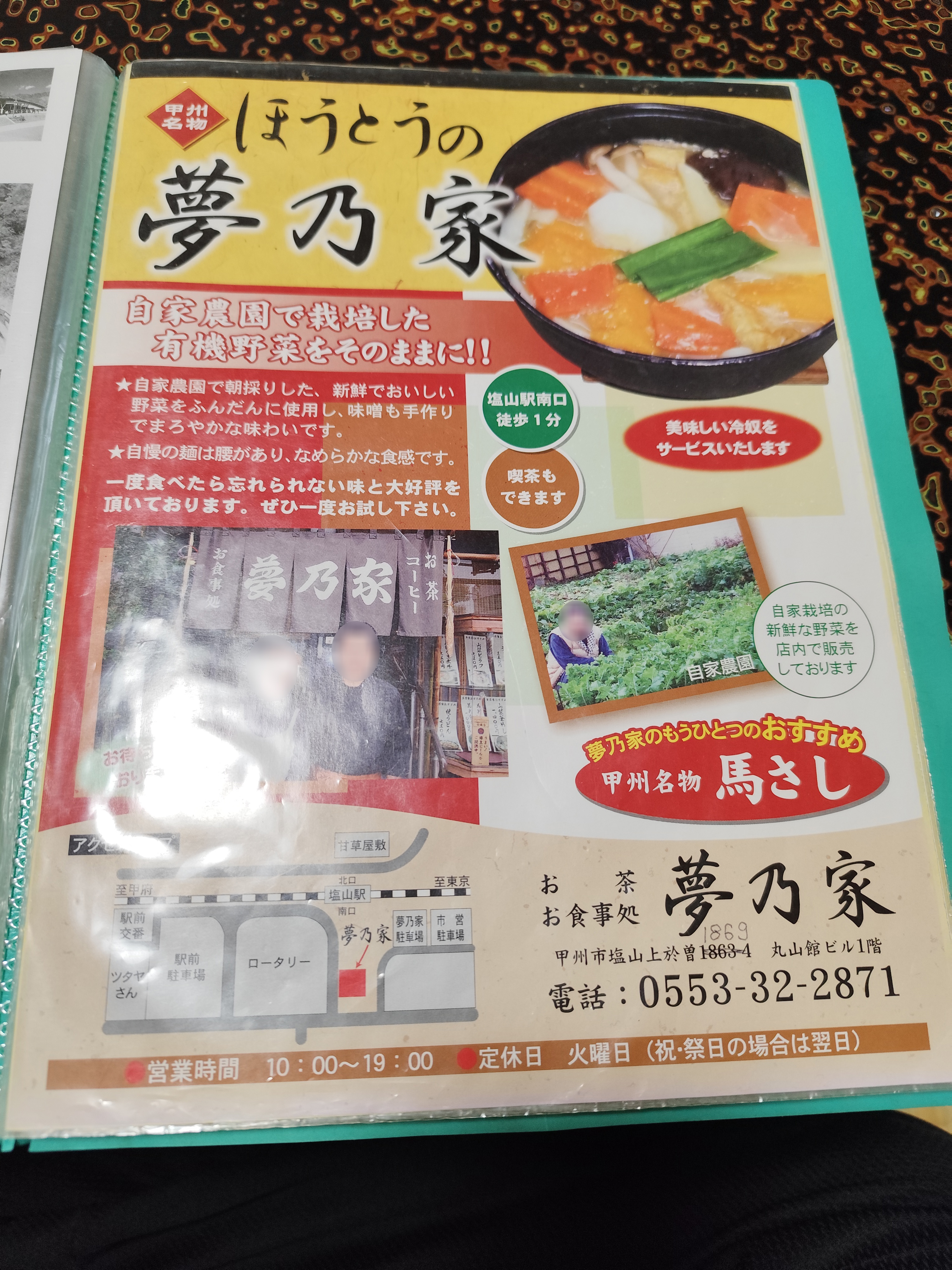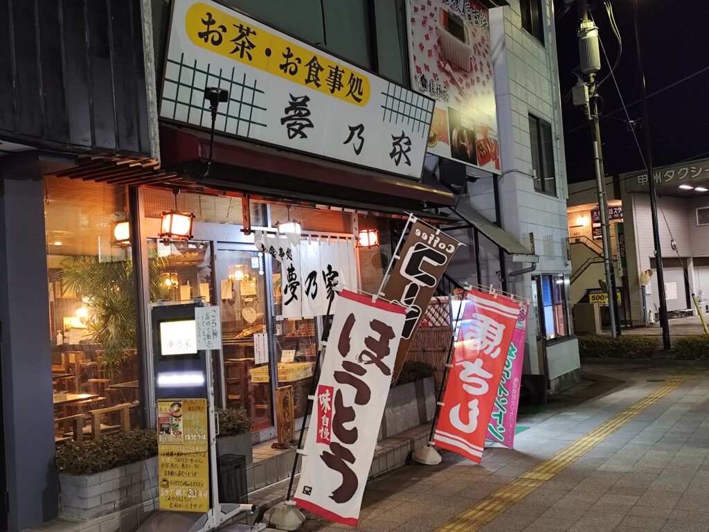 どうやら「夢乃家」では、ほうとだけでなく馬刺しもいただけるらしいし、自家農園の野菜を使っているという。おまけに塩山駅前とロケーションもバッチリ! このチラシを目にした時点で、翌日の夕食が決まったようなものだった。