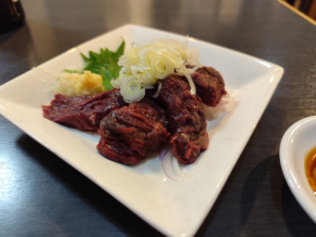 馬刺しは赤身がしっかりとして、見た目もジューシー。生姜やニンニク、ネギをちょっと乗せ、少し噛んでいるうちに口の中に広がるほのかな味わいがたまらなかった。