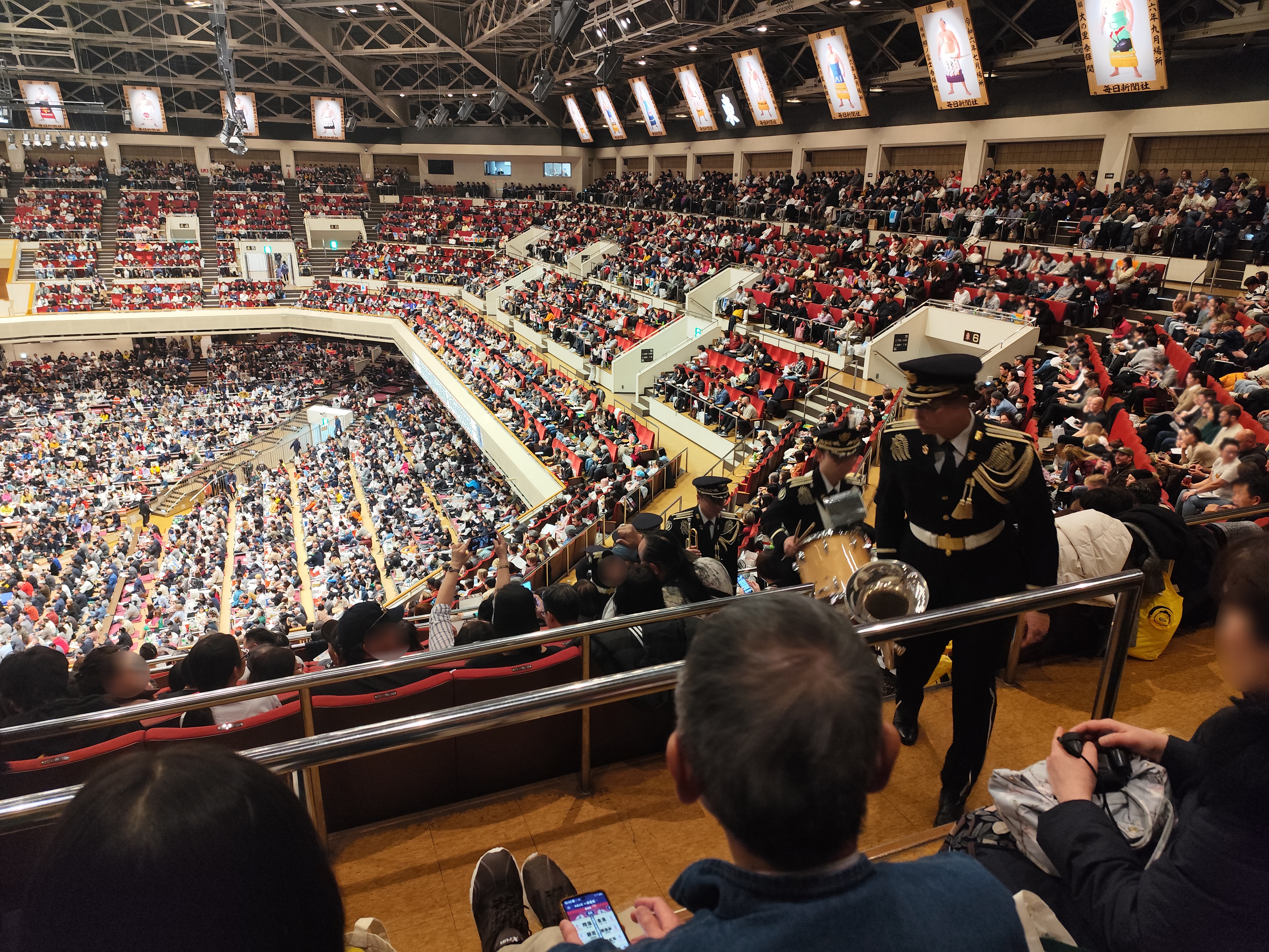 今回、ワタシたちの席は向正面の2階。そして、数ブロック先には「君が代」を演奏する自衛隊の音楽隊が入るであろうスペースが用意されている。つまり、ワタシたちの近くを自衛隊の音楽隊が通るんじゃ…と思っていたら、本当に音楽隊がやってきた!