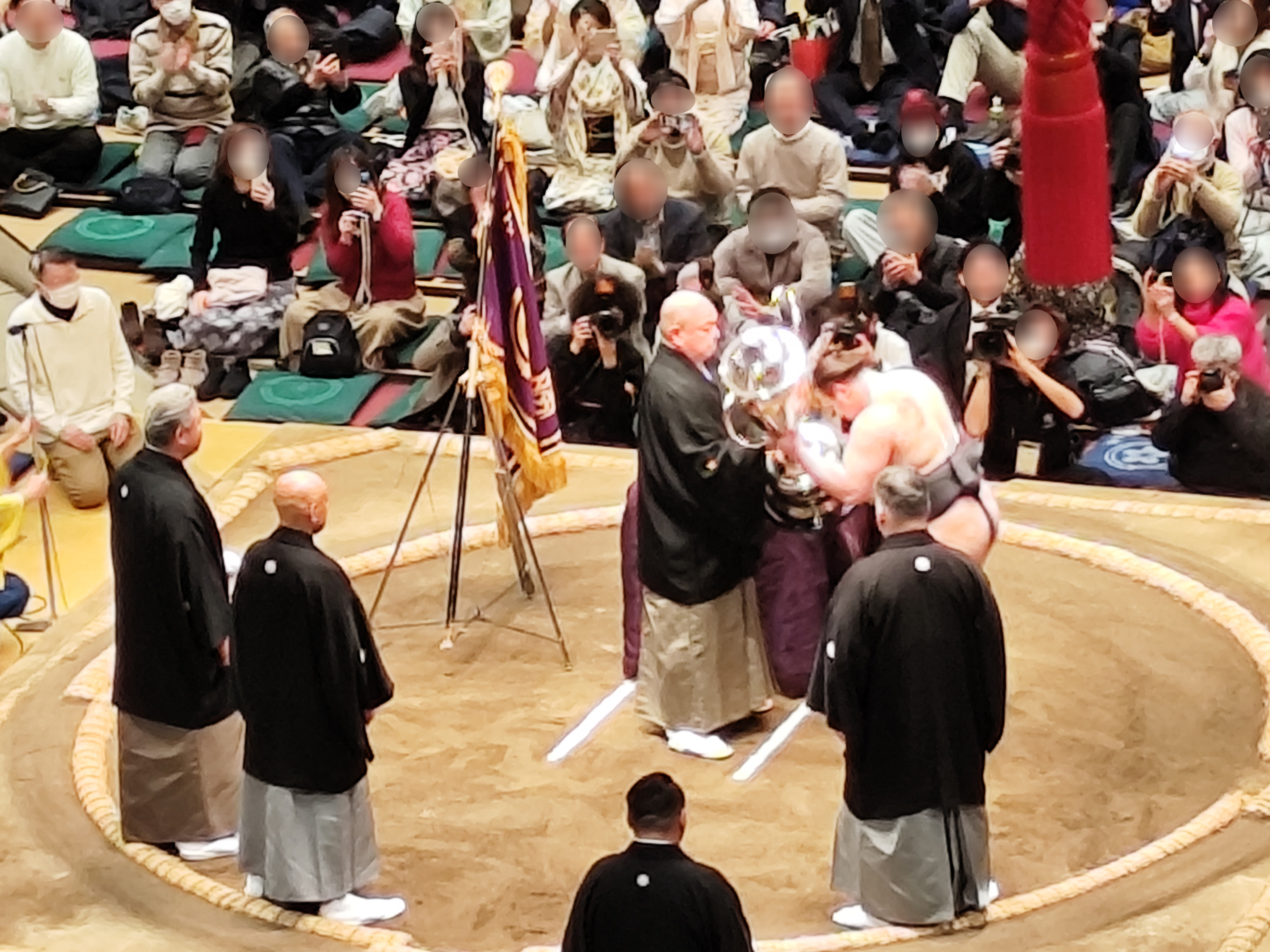 ワタシたちにとっては残念な結果に終わってしまったが、それはそれ。安青錦の表彰式をしっかりと見守る。もともとKは「自衛隊の演奏で『君が代』を歌う!」と意気込んでいたくらいだから、優勝決定戦が終わったところで帰るわけもなかった。