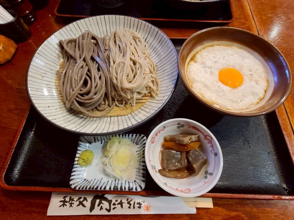こちらの「山寿」は店名にあるとおり肉汁が売りのようなので、ワタシは「肉汁そば[肉2倍量]肉ダブル」(税込1,628円)を注文する。一方、とろろが大好きなKは迷わず「月見とろろ 冷やしとろろそば」(税込1,518円)を選んでいた。