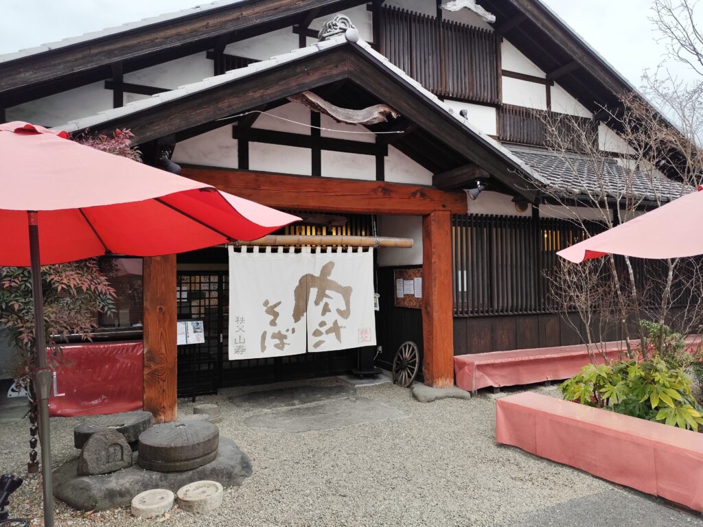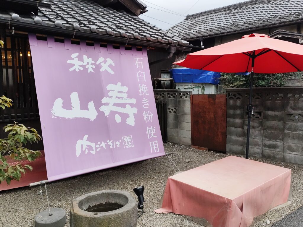 案の定、ワタシたちが最初に目星をつけたおそば屋はすでに終了。2軒目も同様だった。そこでワタシはすぐさまマップアプリの某先生でお店を検索。18時まで営業しているおそば屋が秩父の市街地にあることがわかる。それが「元祖秩父肉汁そば山寿」(以下、「山寿」)だった。