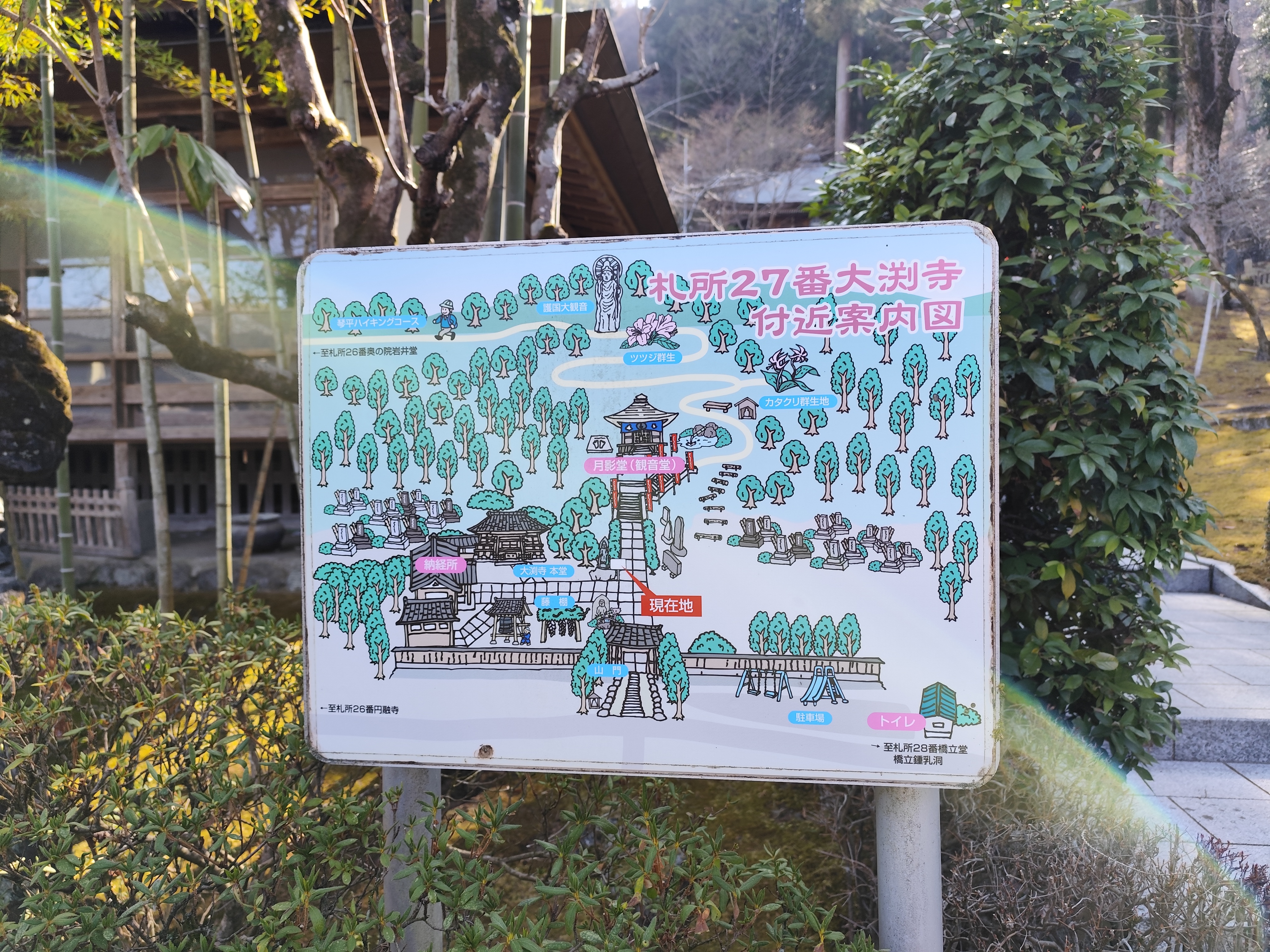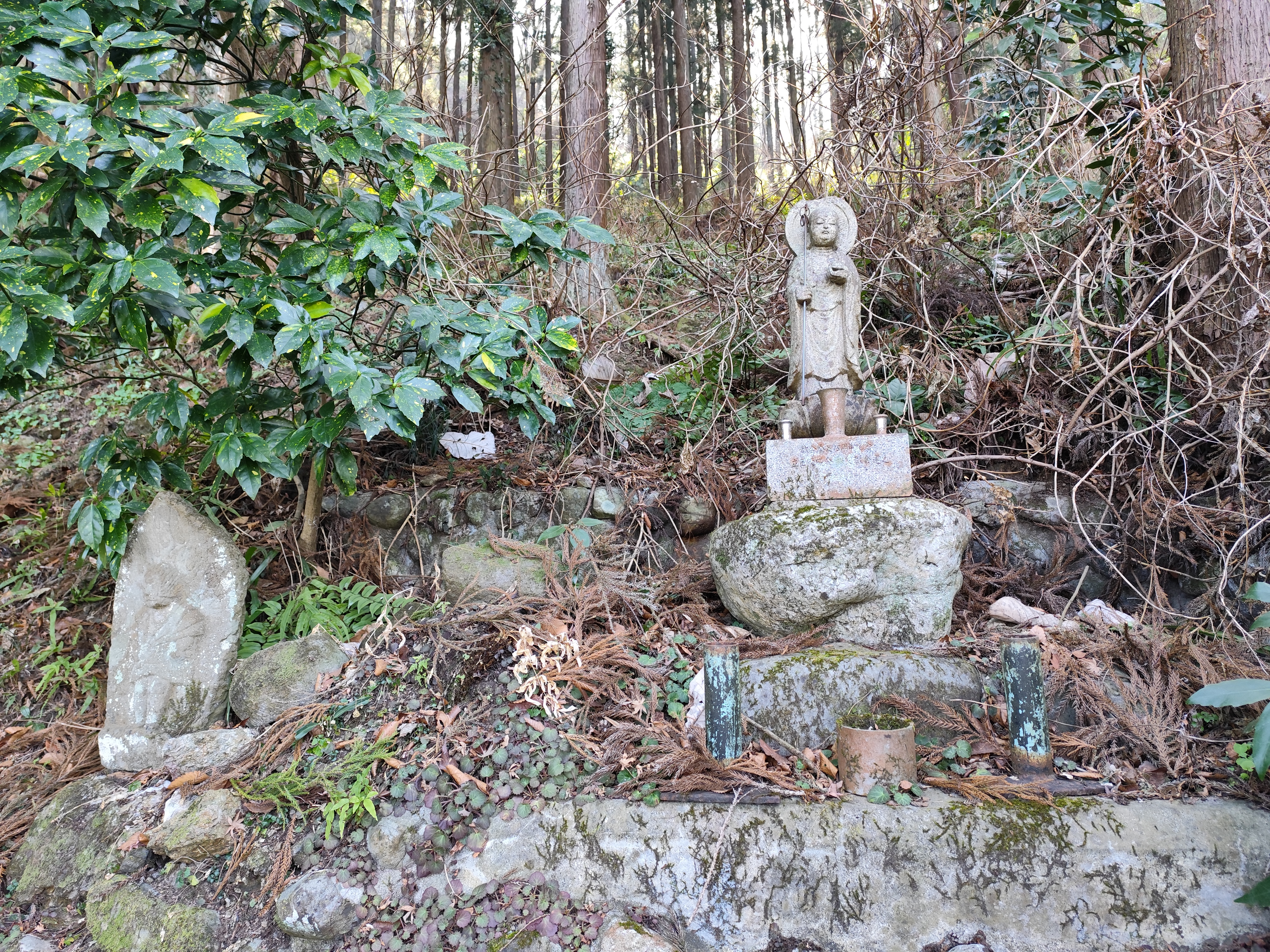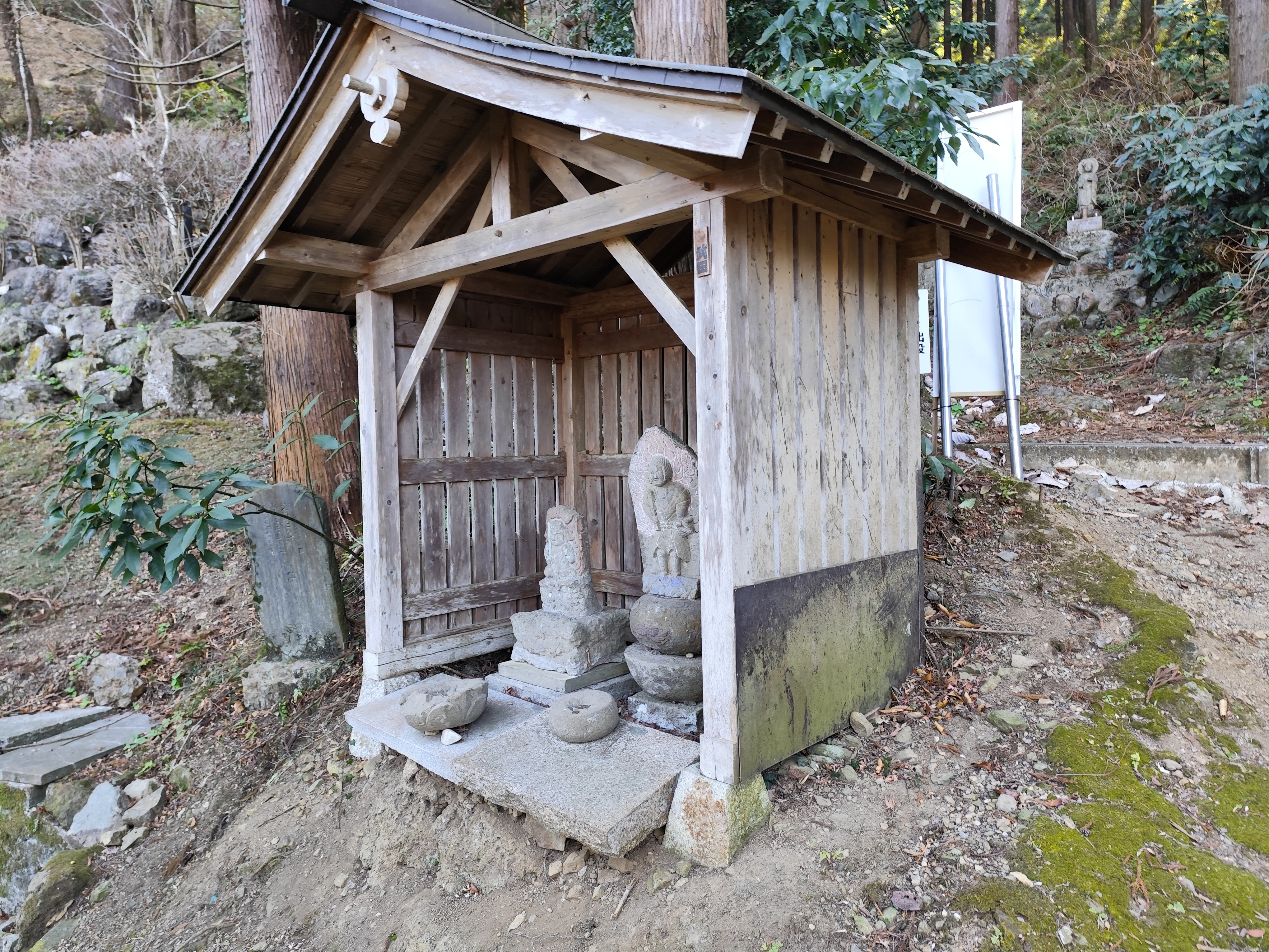 先述のとおり「大淵寺」の裏手には護国観音があり、参道が月影堂のそばから山の上へ続いている。小さな不動堂が立っているので、こちらを護国観音への参道入り口の目印にするといい。