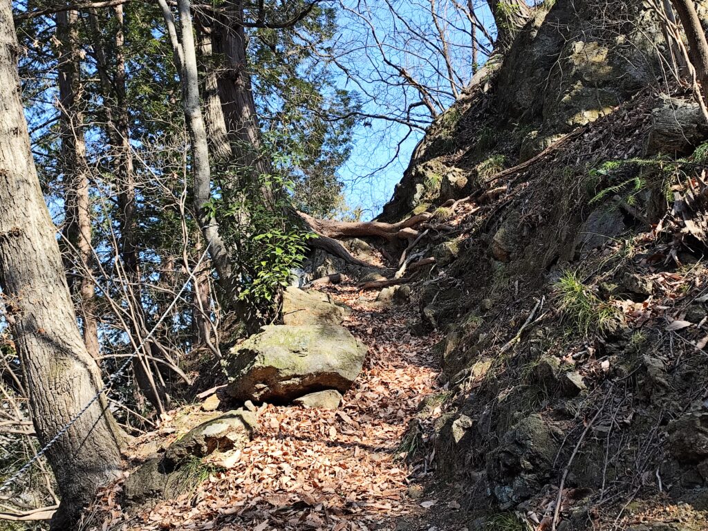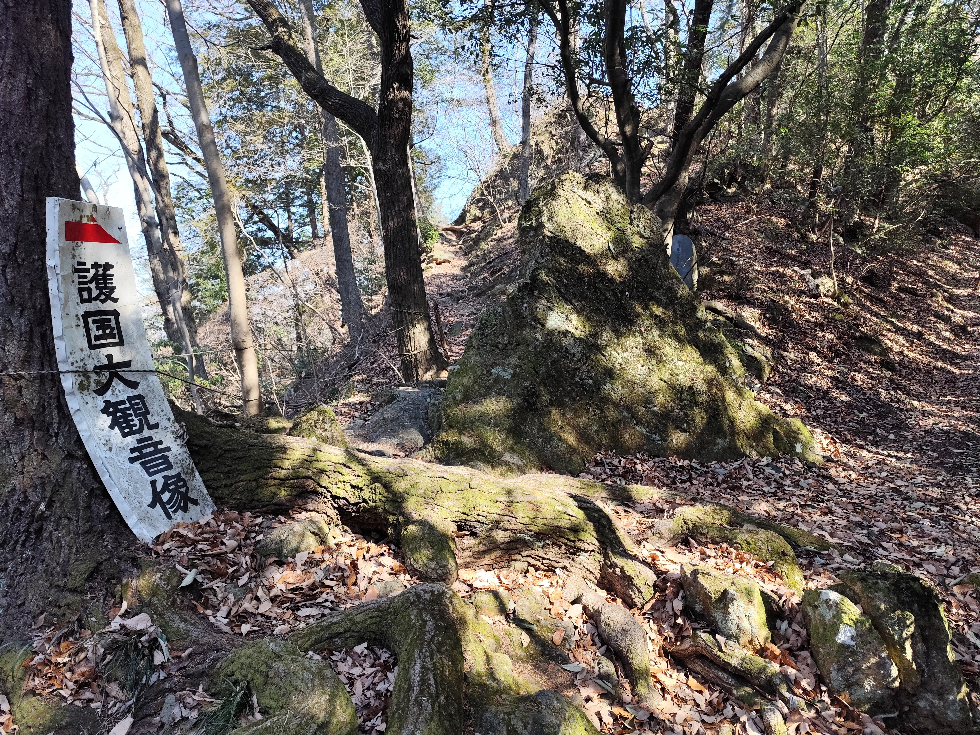 ただし、護国観音の手前の看板や建立記念碑があるあたりから、参道が急に険しさを増す。