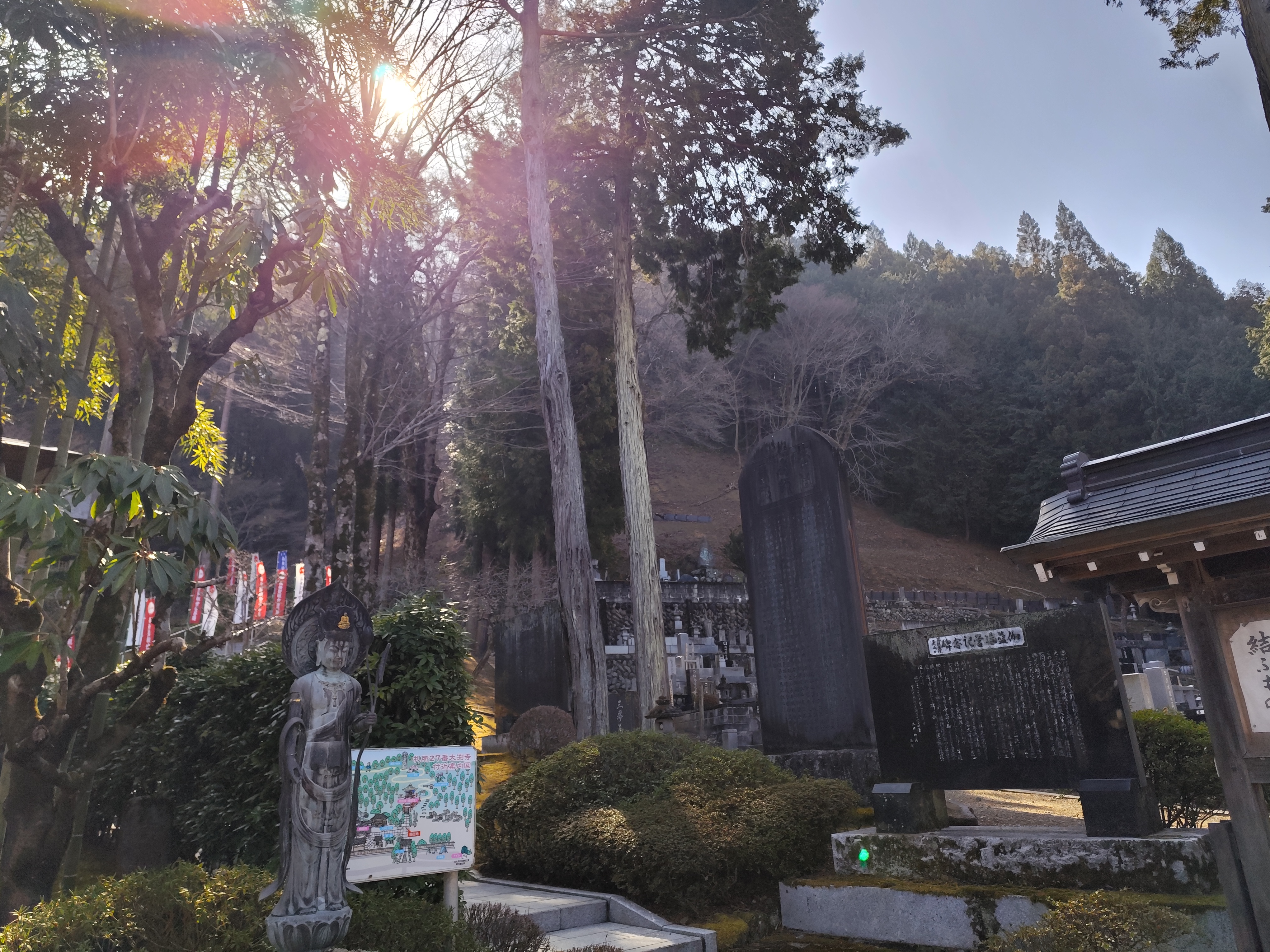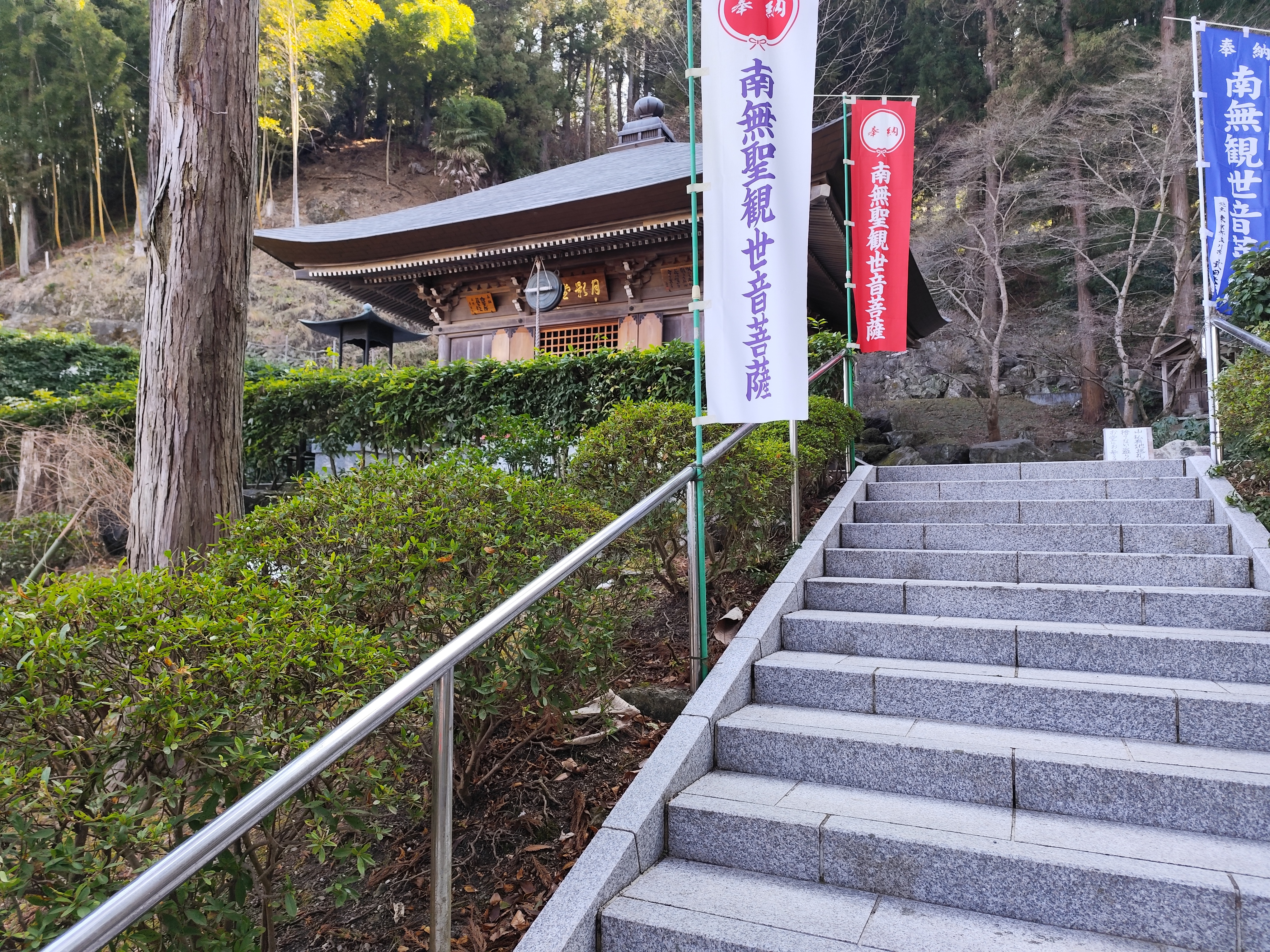 月影堂へと続く石段は聖観音像と見上げるような高木の間にある。