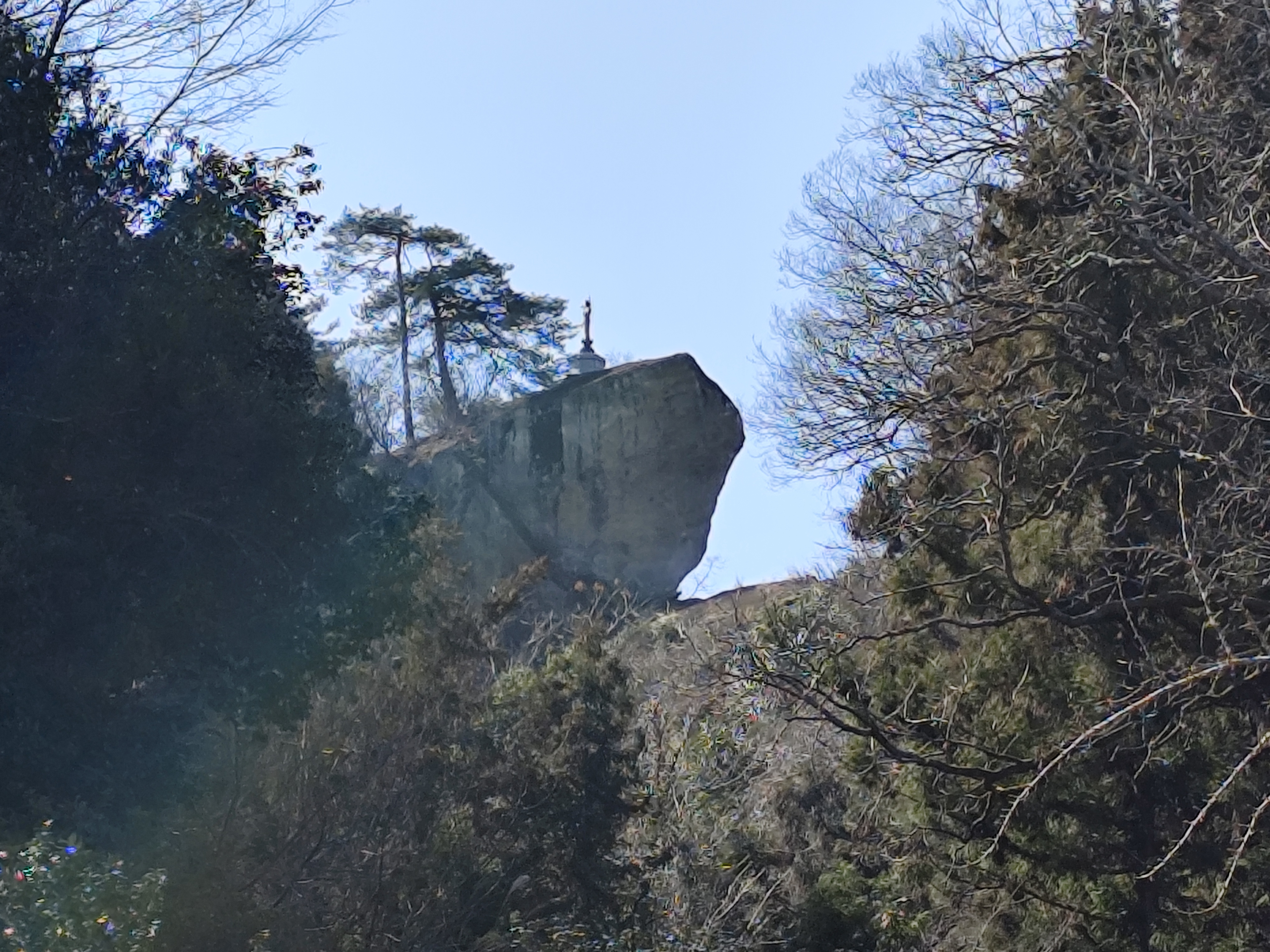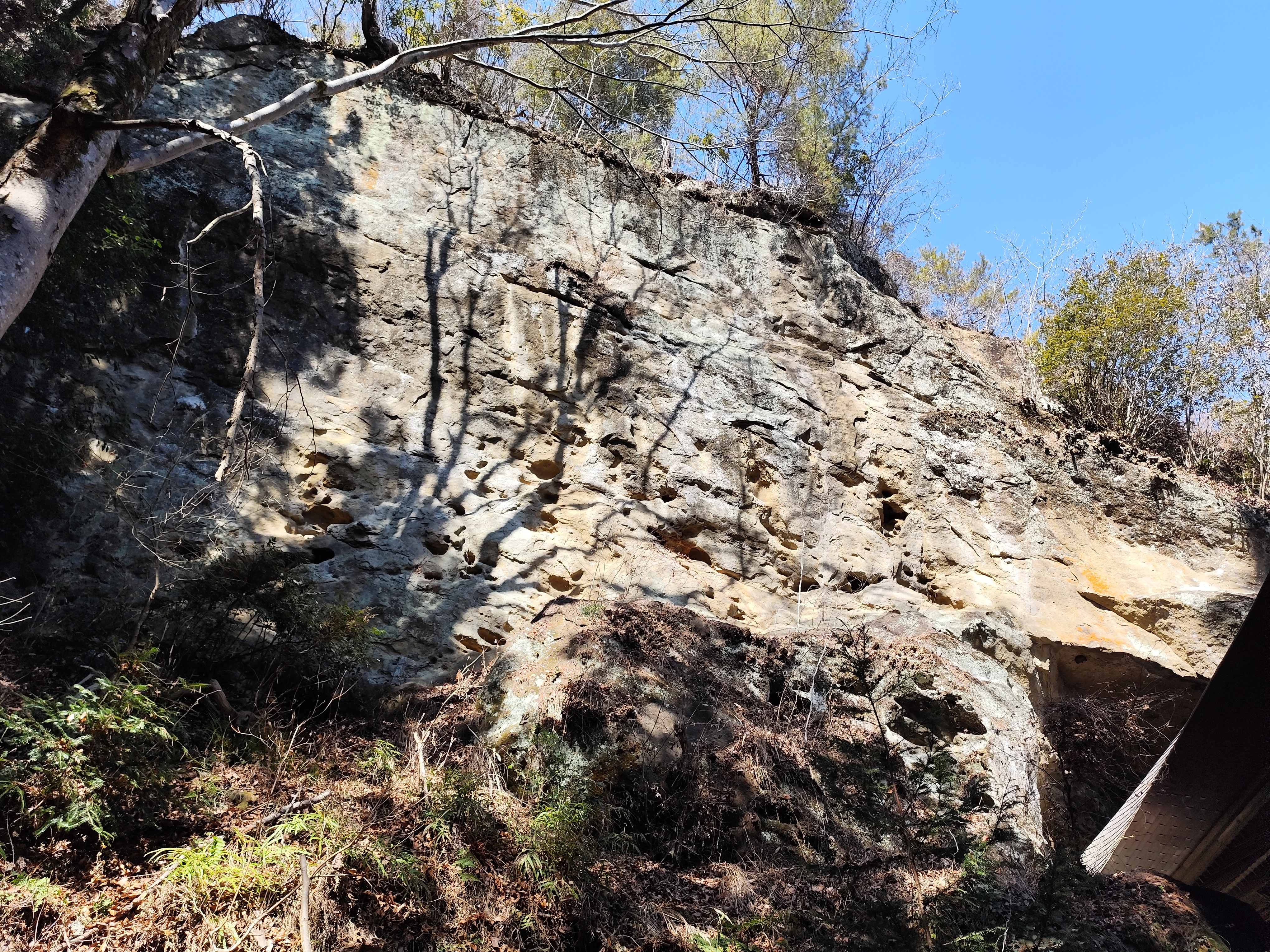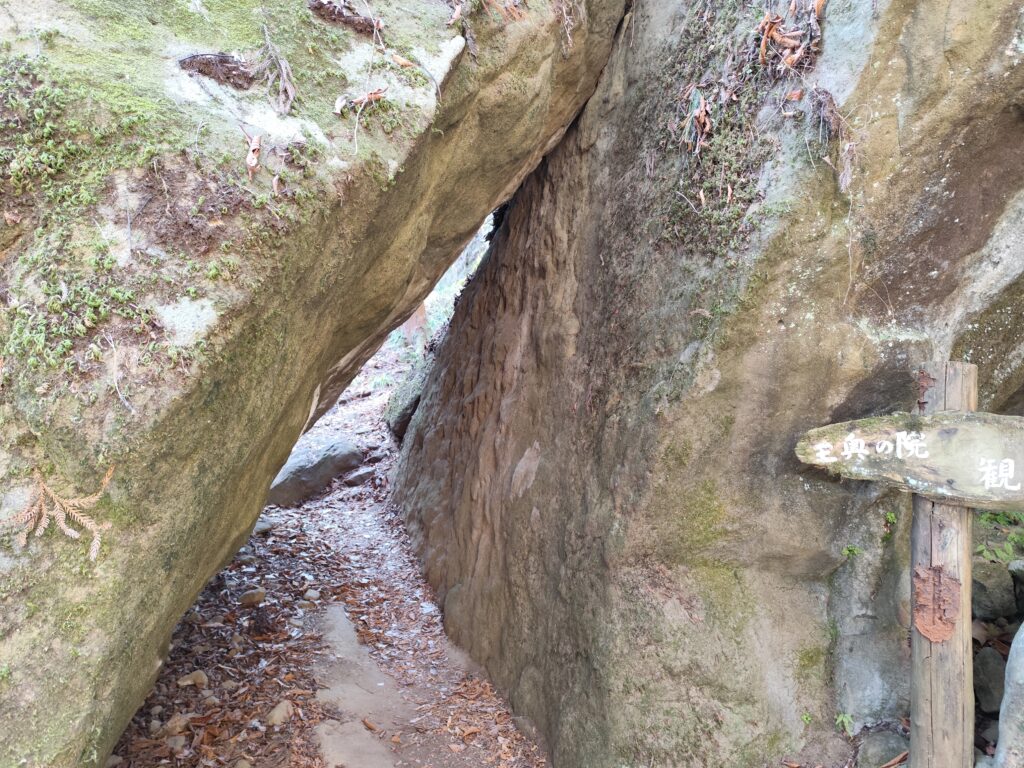 観音堂までの参道で特に注目したいのが、まるで斜面から突き出たように延びたまま止まっている巨岩だ。こちらの巨岩を見たとき、ワタシは山梨県山梨市の「廣蔵院」にある巨岩を思い出した。
