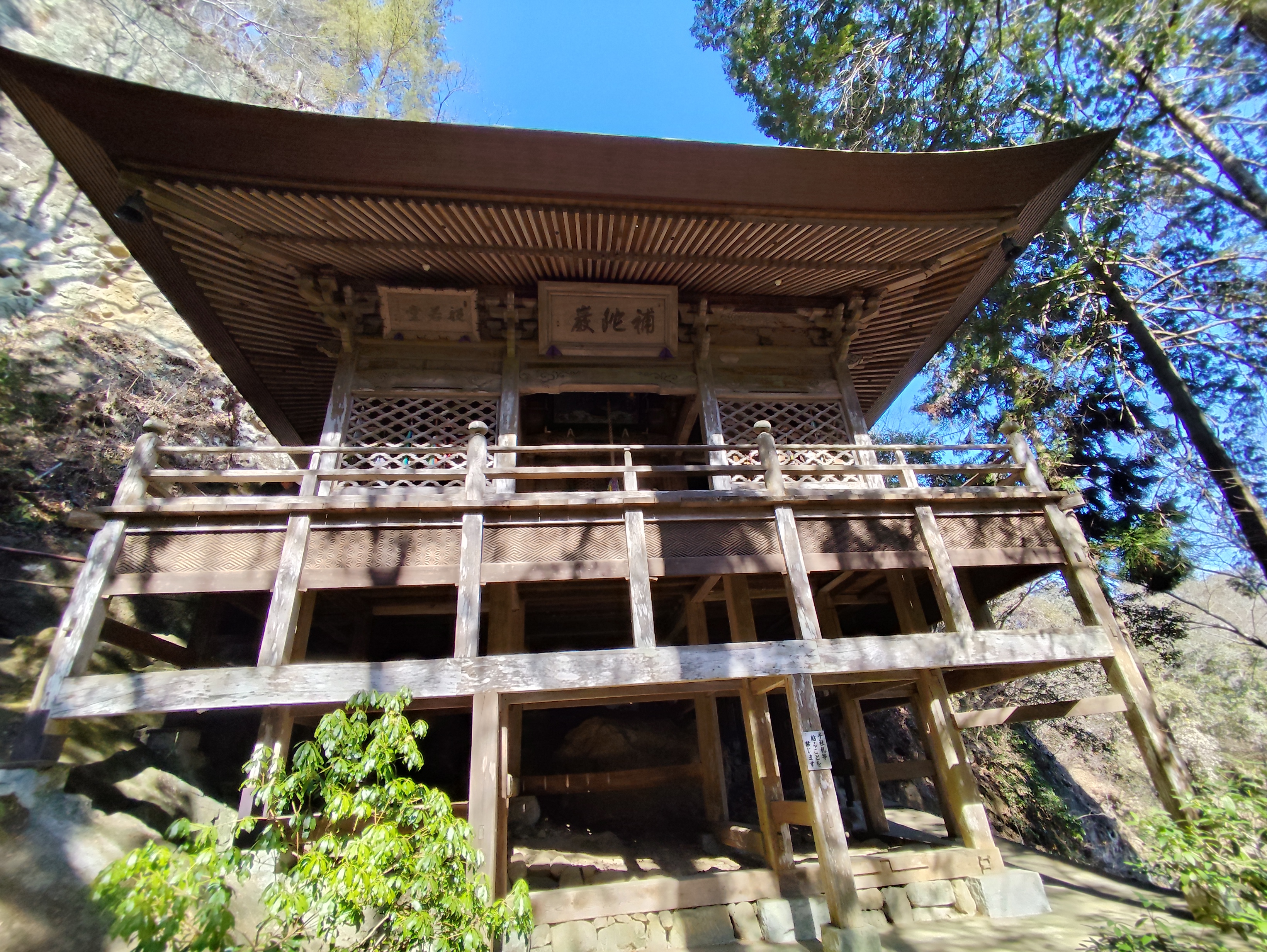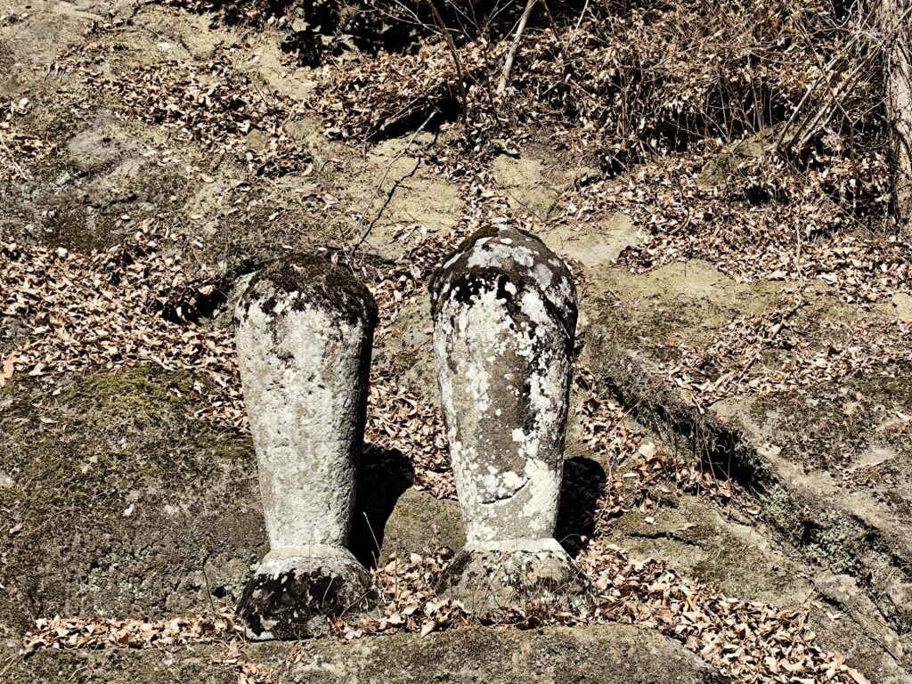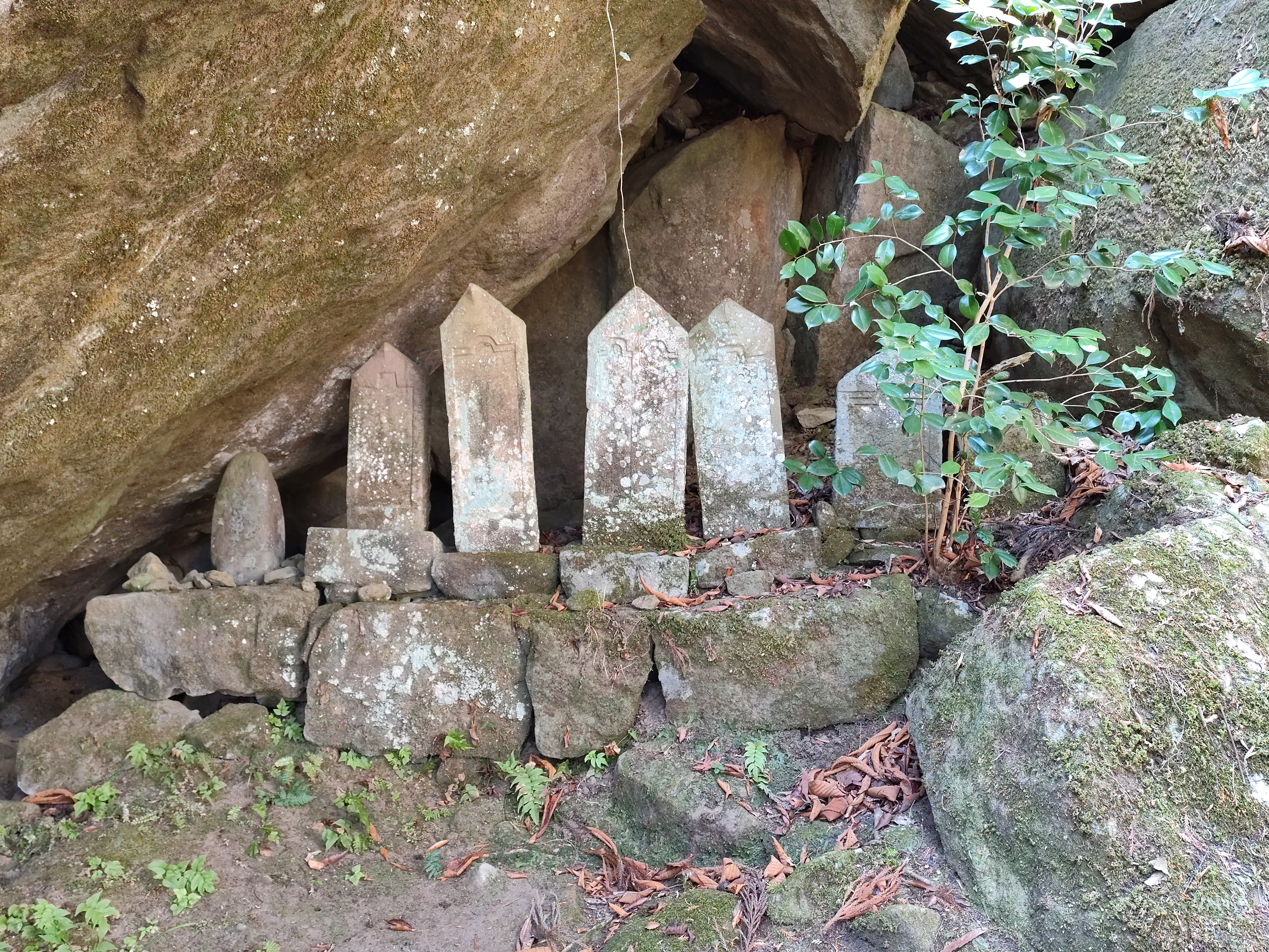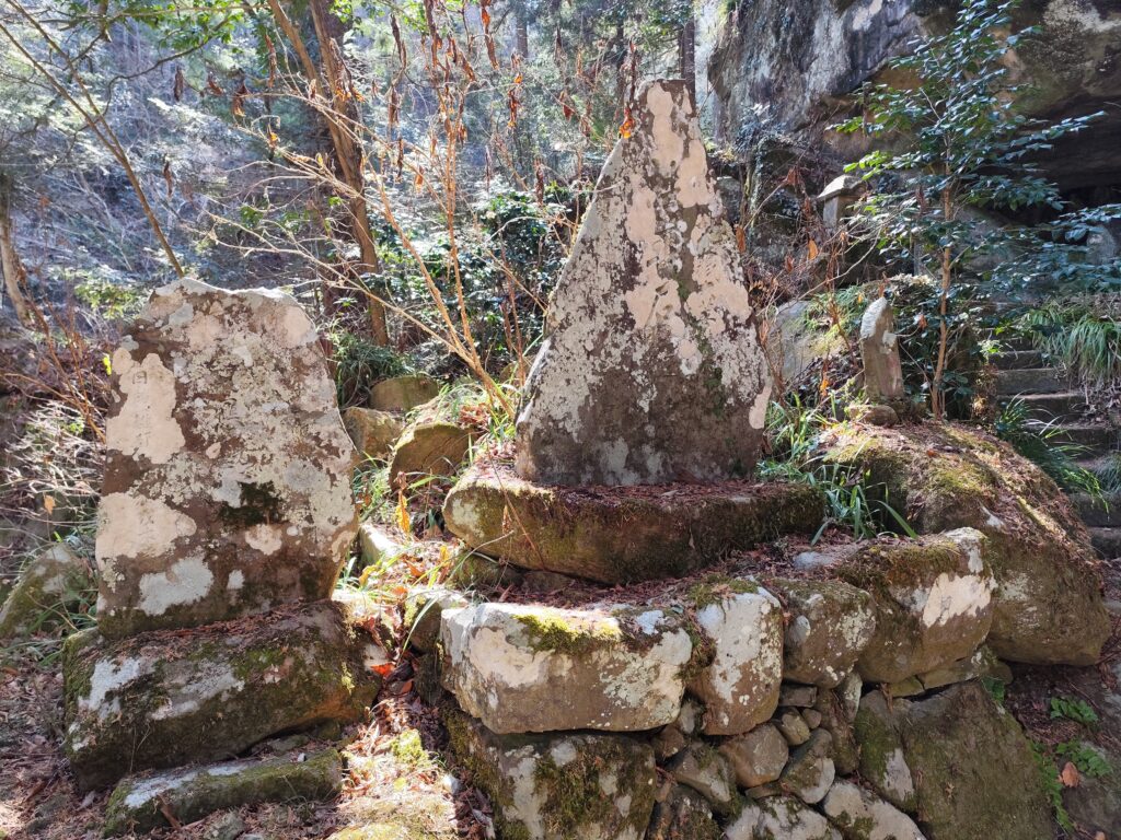 毘沙門堂を過ぎたあたりまで来ると、懸造りの観音堂が木立の向こうに見えてくる。さらに、目の前には巨岩まで。このあたりになると古い石仏や石碑も散見されるようになり、世間の喧騒からは切り離された、神域と言いたくなるような雰囲気がより強く漂ってくる。