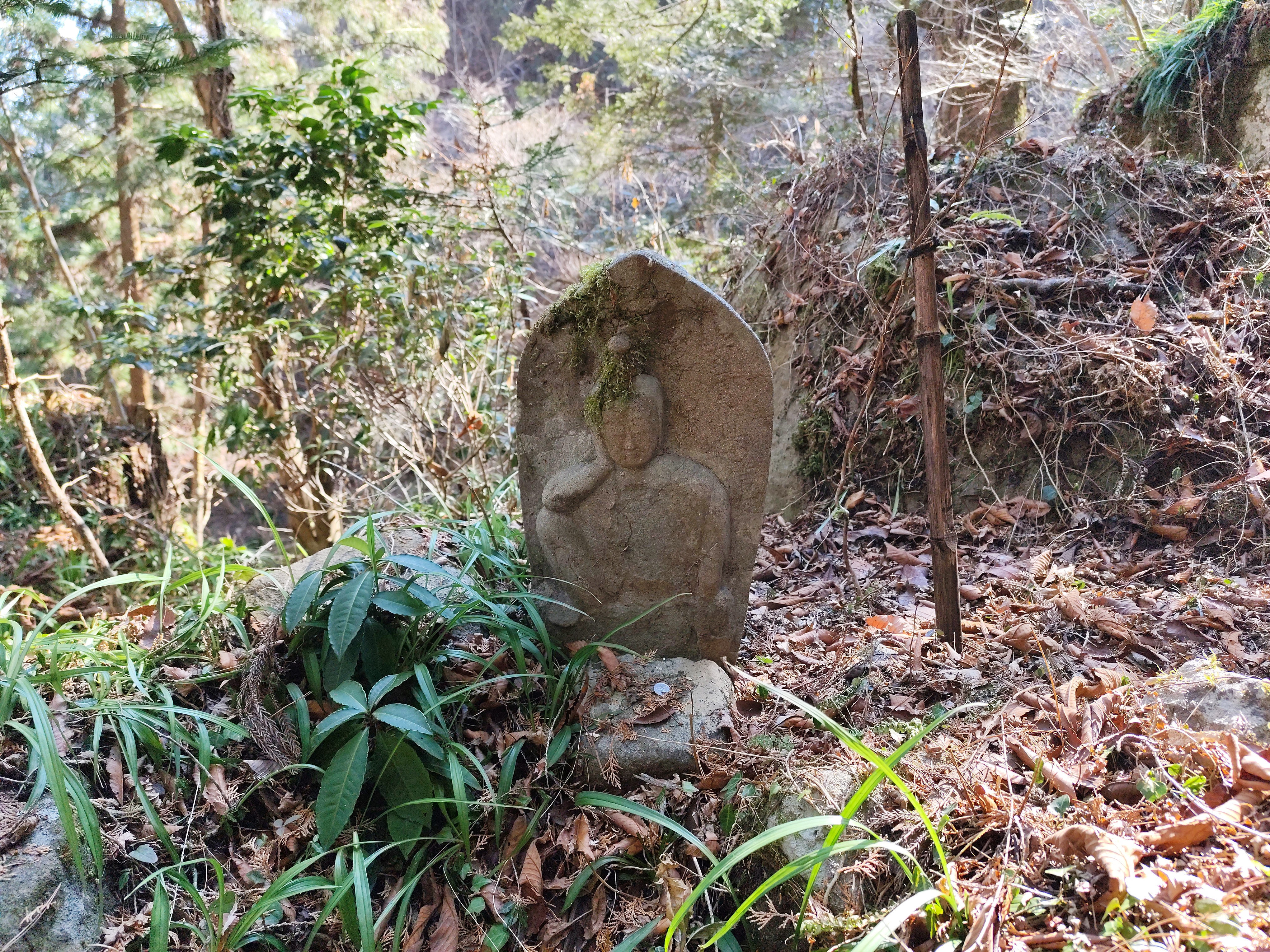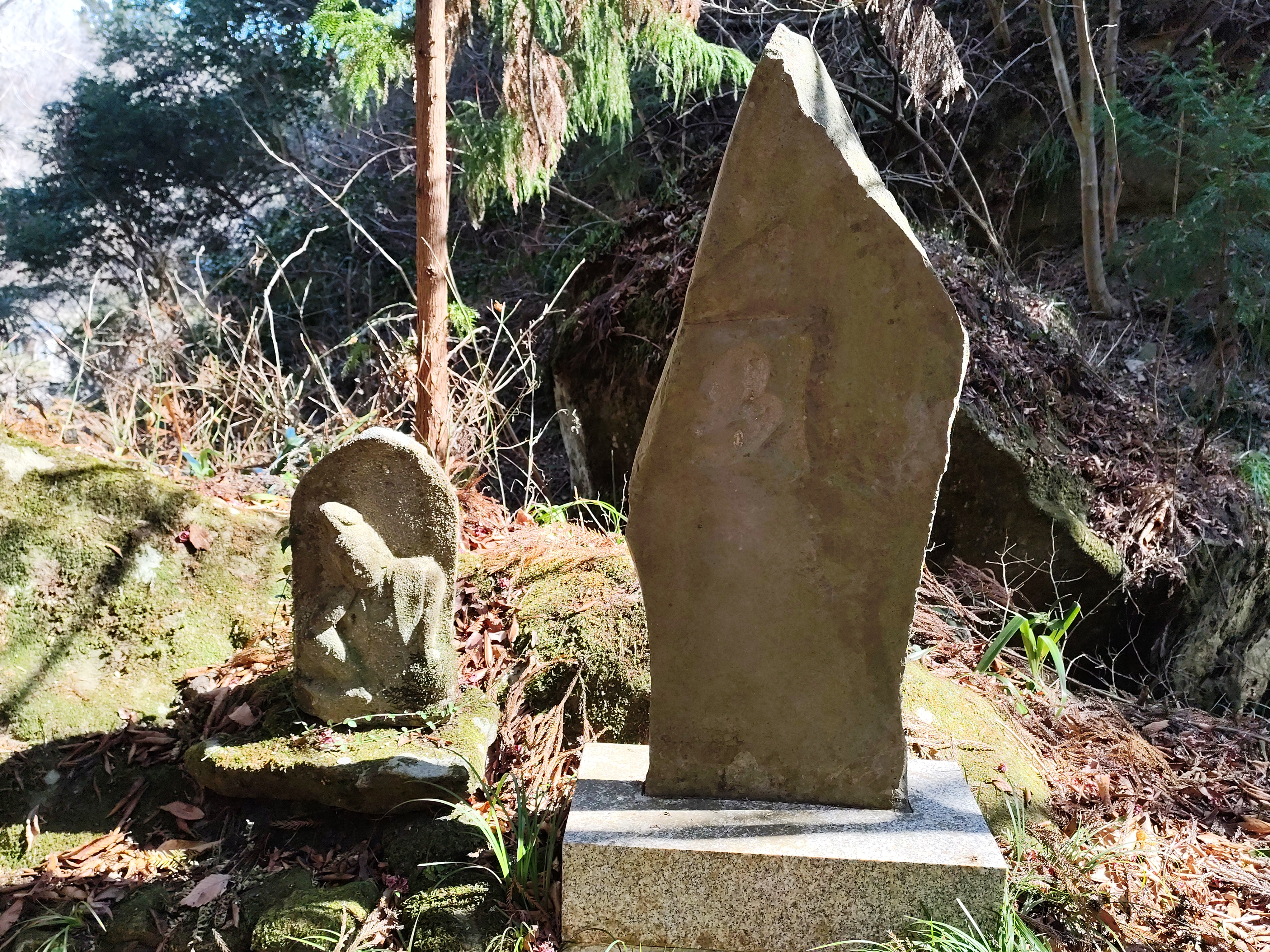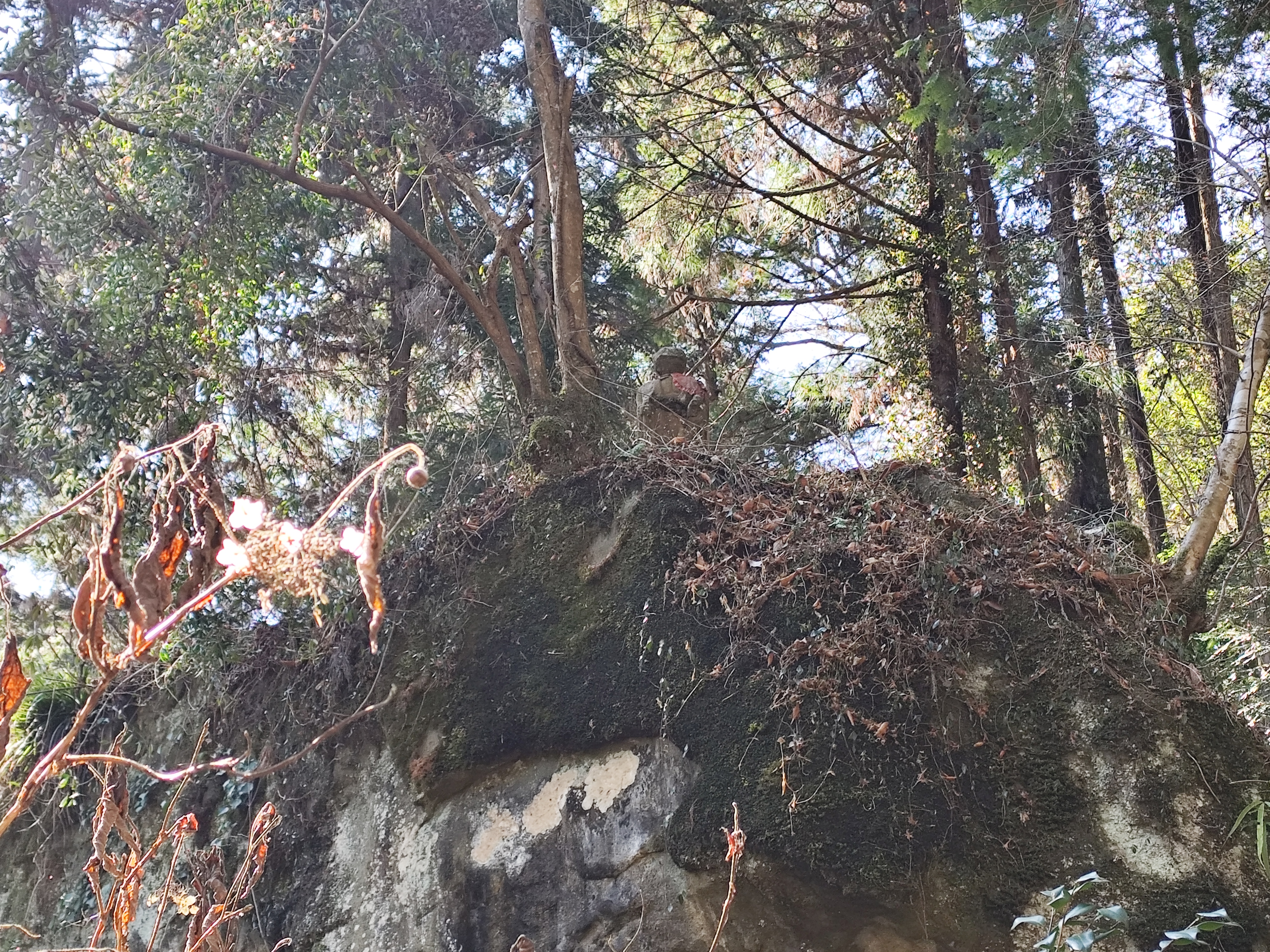 毘沙門堂を過ぎたあたりまで来ると、懸造りの観音堂が木立の向こうに見えてくる。さらに、目の前には巨岩まで。このあたりになると古い石仏や石碑も散見されるようになり、世間の喧騒からは切り離された、神域と言いたくなるような雰囲気がより強く漂ってくる。