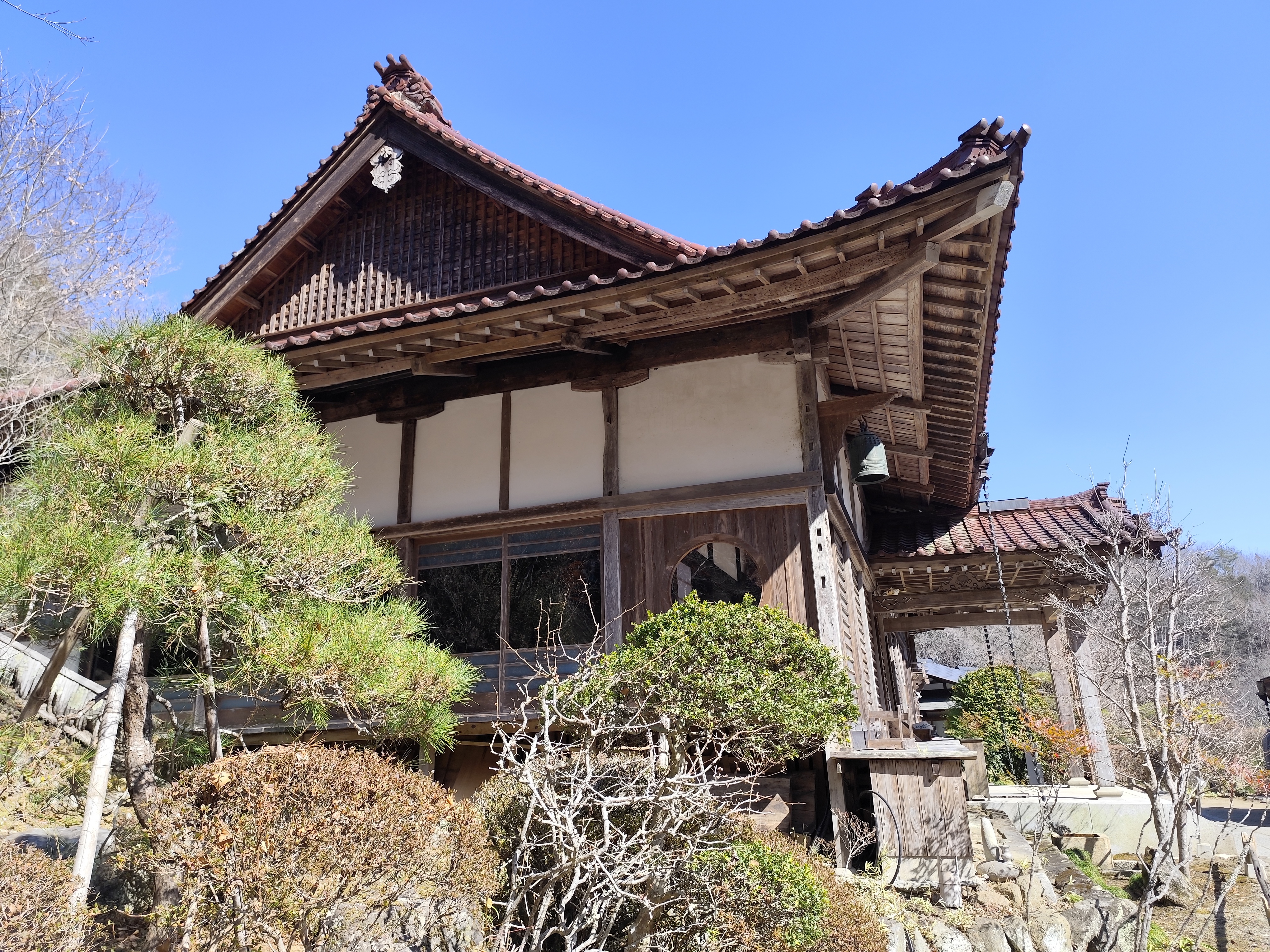 船のような形をした岩盤に奥の院があり、苔が美しいことから「秩父の苔寺」とも呼ばれる寺院。奥の院には岩盤の上にお船観音が立ち、岩窟に大日如来の銅像が安置されている。奈良時代、行基が6寸2分(約23.5cm)の聖観世音菩薩像を彫り、この地の岩屋を穿って安置。奈良時代後期から平安時代初期の延暦年間には、弘法大師が大般若経600巻を書写して奉納したという。鎌倉時代の貞永元年(1232)に眼応玄察和尚が曽祖開山。江戸時代、智外宗察和尚のときに曹洞宗に改宗し、伽藍が現在の形に整えられた。舞台造り(懸造り)で3間(約5.5m)四面の観音堂は江戸時代の宝永4年(1707)に建立。本尊の聖観世音菩薩は約1.4mの立像で、行基の作という言い伝えも残るが、室町時代に作られたようである。また、前立本尊は宝冠の上に笠をかぶり、船を漕いでいるという珍しい姿をしていることから「お船観音」と呼ばれている。