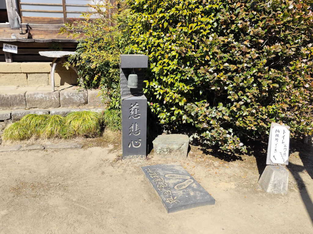 本堂の前は観音堂へと続く参道が横切っていて、参道沿いにはお船慈母観世音の像、西国・坂東・秩父の日本百観音霊場の百観音御砂踏、他にも石碑や石仏、お船観音の再建記念碑などが点在している。