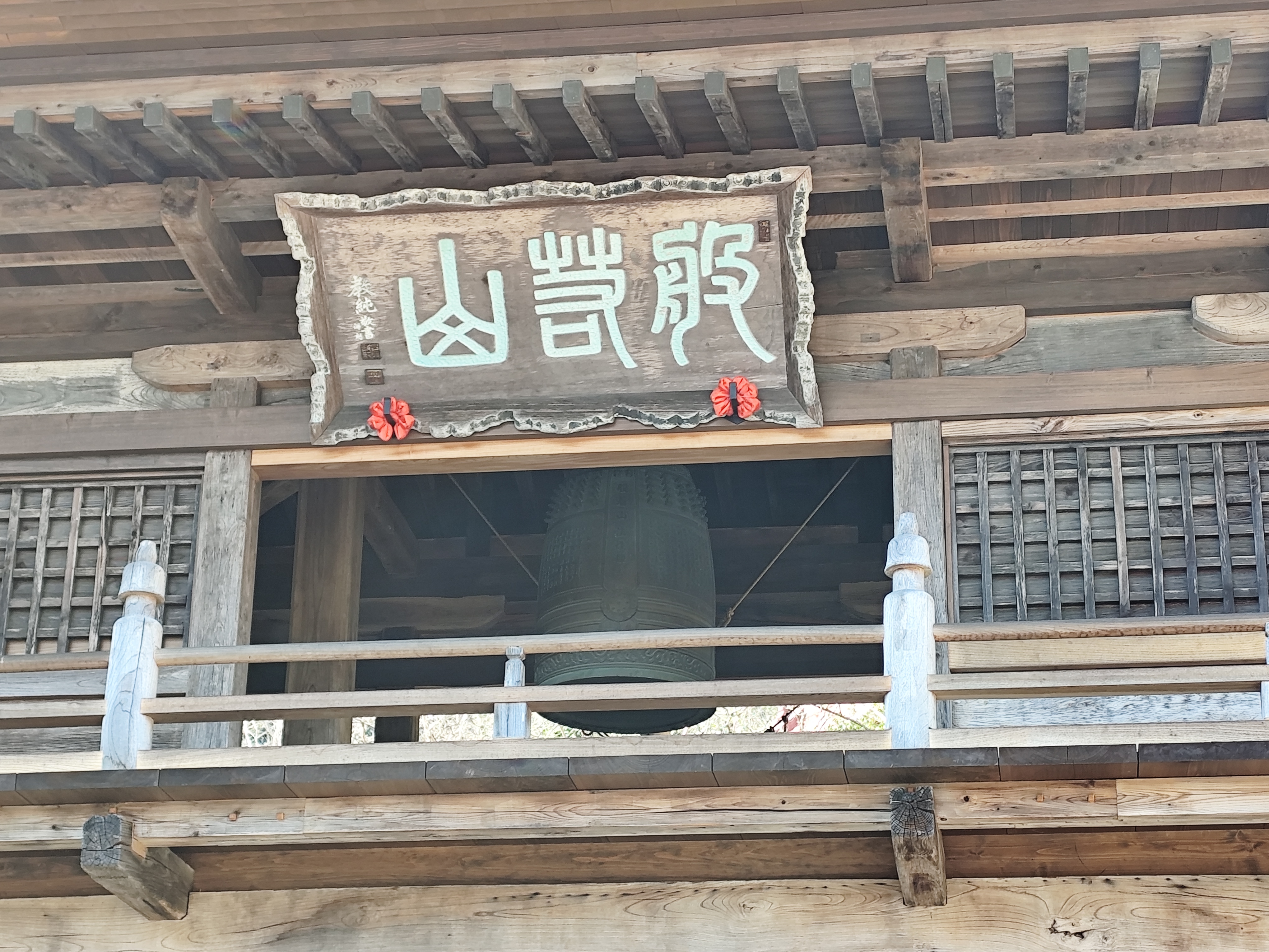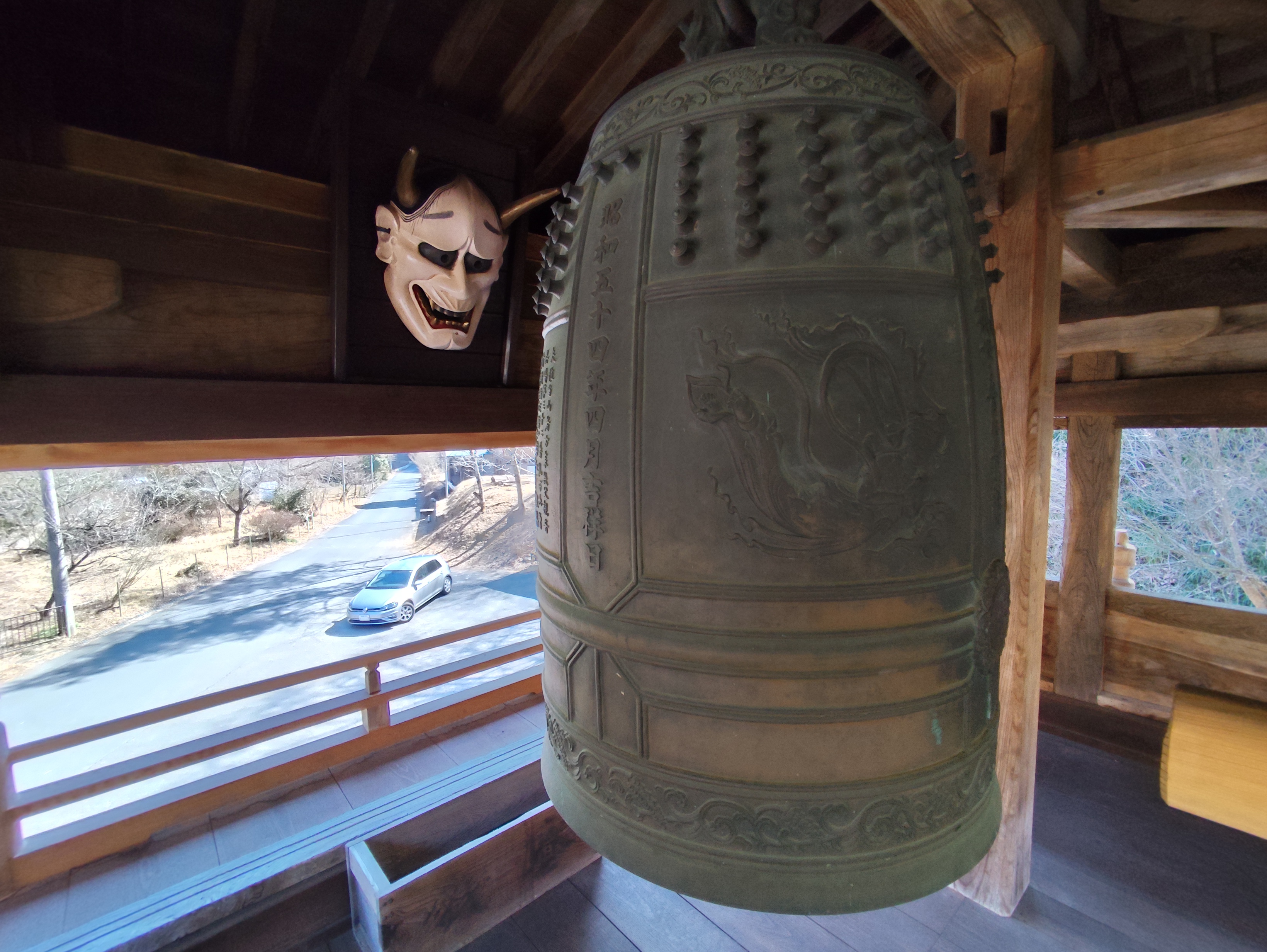 鐘楼門の梵鐘のそばにもあったが、本堂の向拝にも般若の面が掲げられていた。これは「法性寺」の山号が「般若山」だからだろう。