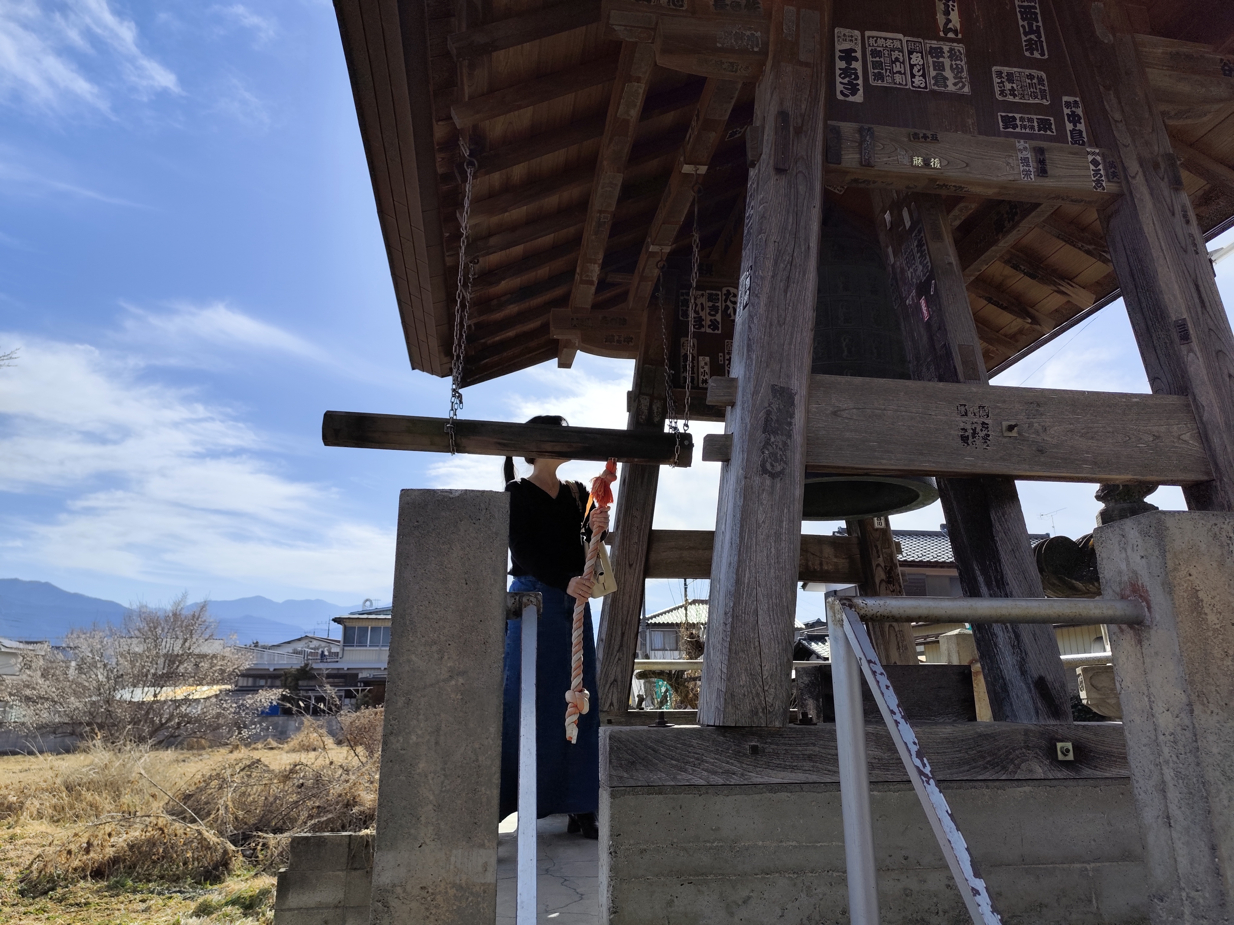 定林寺で鐘楼の鐘を撞くK